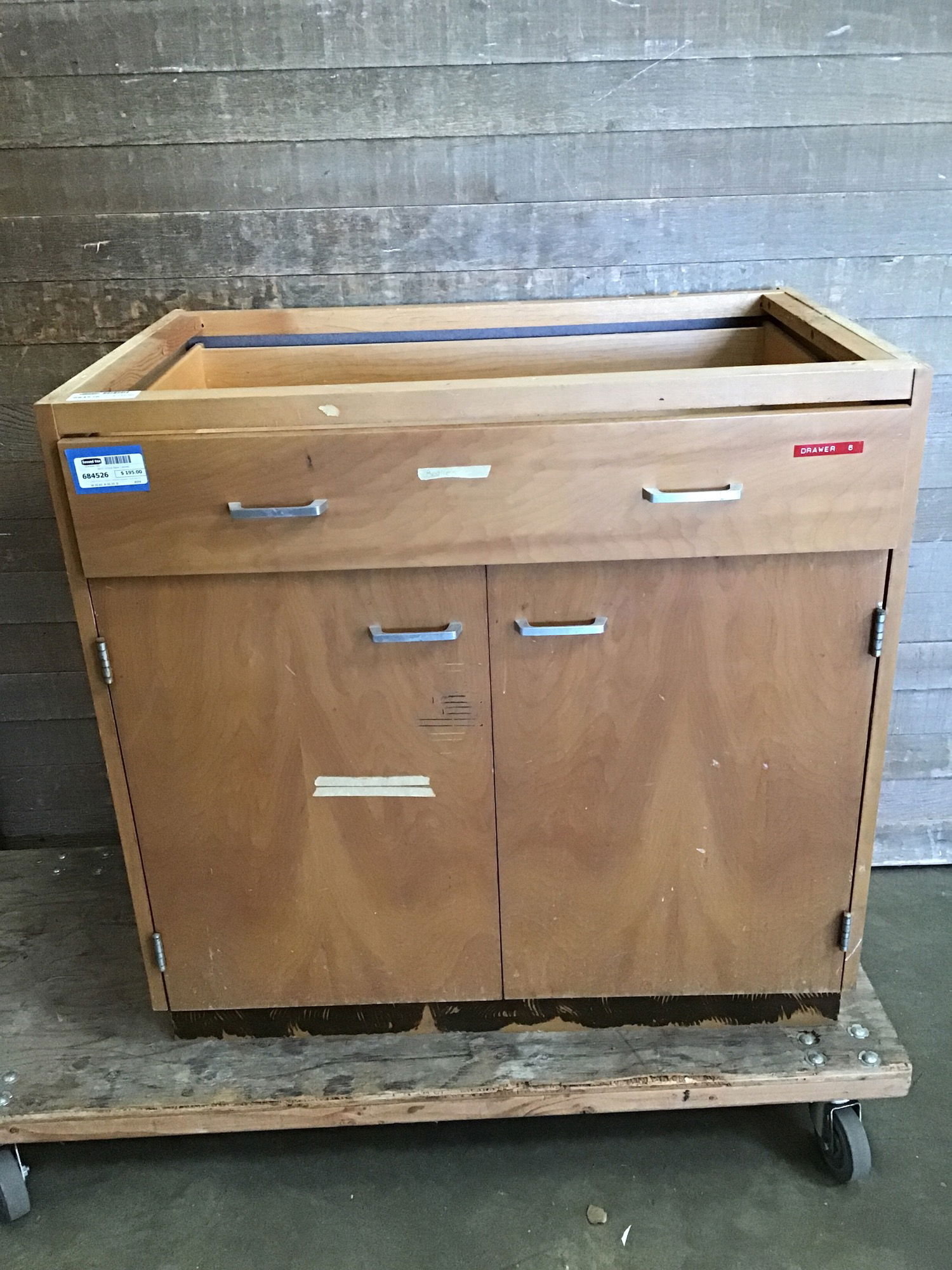 Clear finish (or slightly yellowish stained), flush face birch base cabinet with one slide out drawer and two doors. Would make a great shop cabinet. Sourced from a local middle school!