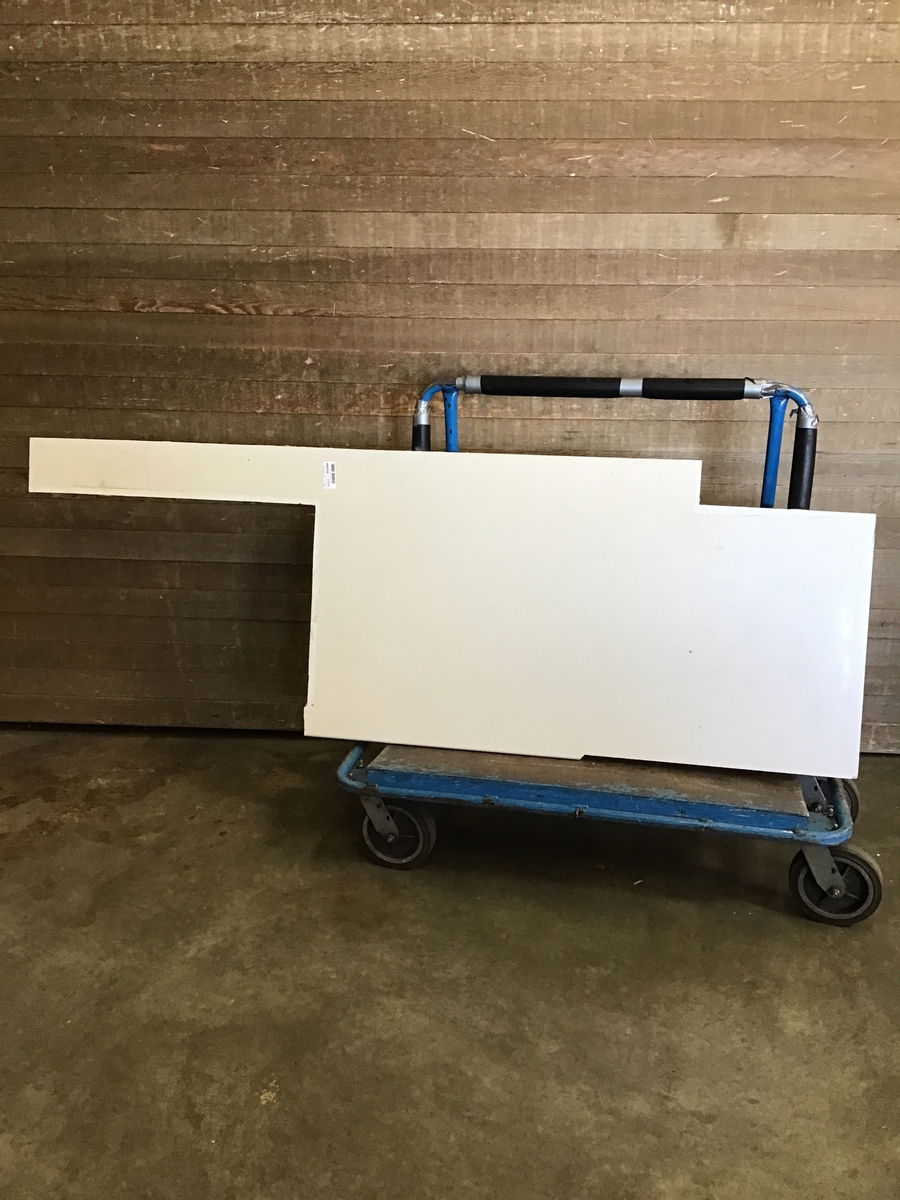Manmade stone countertop, mostly white in color. This is roughly 8.93 square feet of usable counter space, though it is kind of an unusual shape. The SF listed does not include the long piece that sticks out. The edges are cut straight, but unfinished. Dimensions listed are for overall footprint.