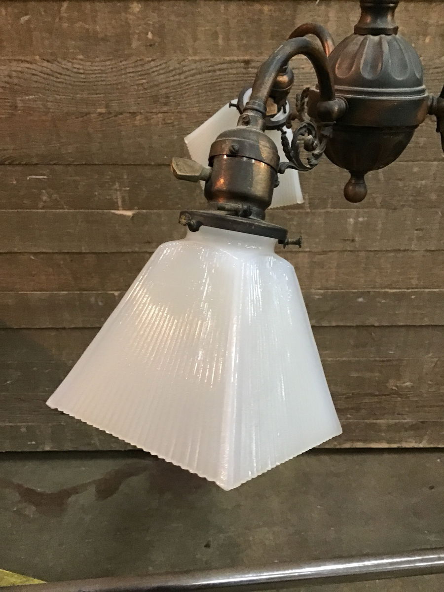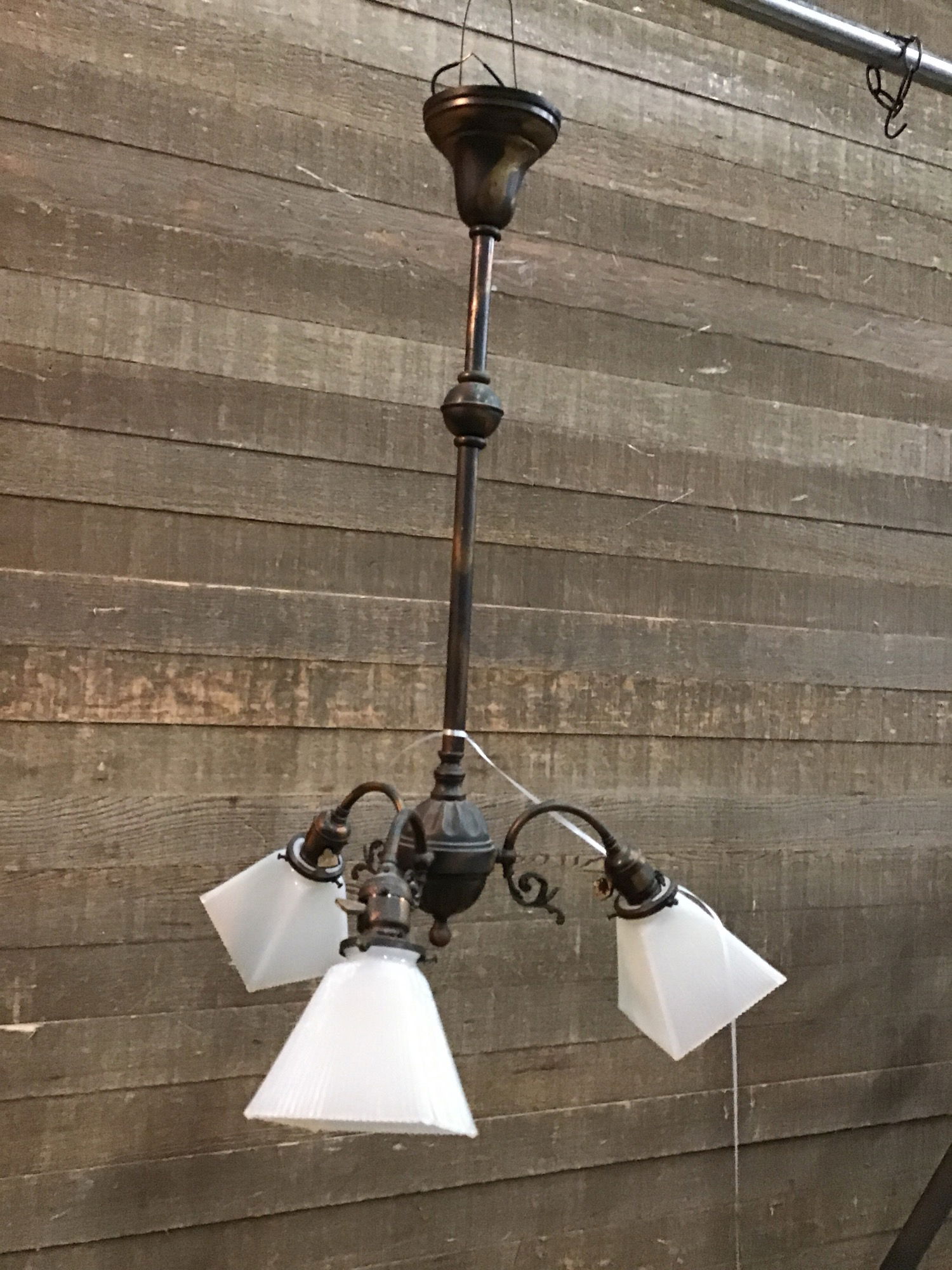 Vintage three bulb pendant light with a Japaned copper finish. Has very pretty deco-style milk glass shades. This light is a real looker!!!