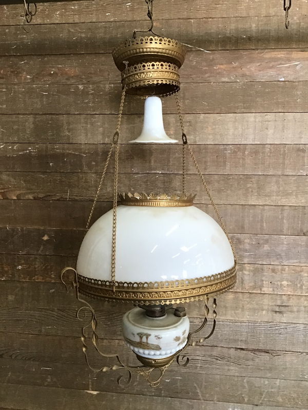 Beautiful gas hanging light with a pulley system to raise and lower. This has a large white glass shade, and a printed scene on the glass base. It looks to be in great condition and would be wonderful piece in any period accurate home! One could also take the project on for turning it electric if desired.