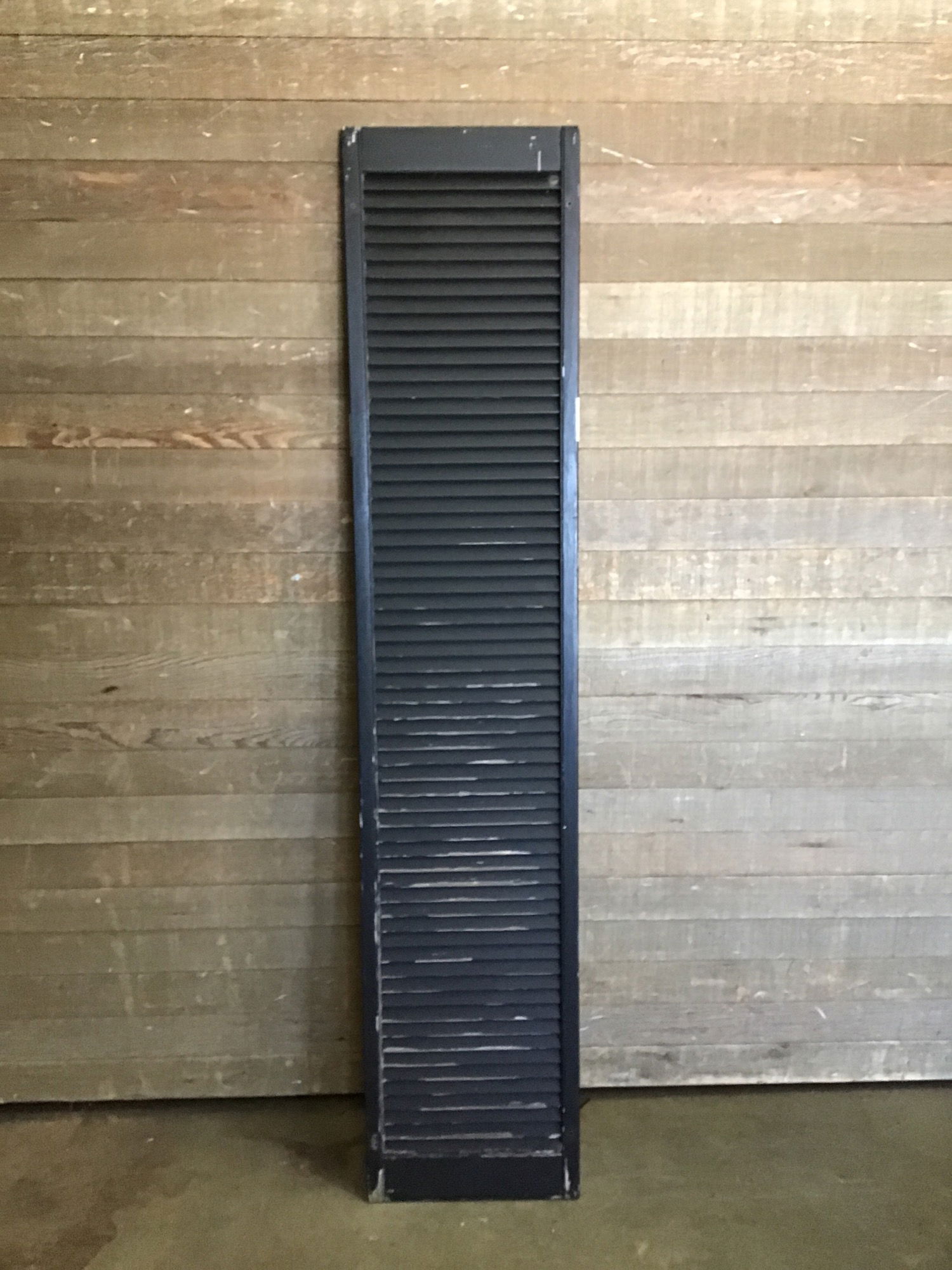 Wood exterior shutter in fair, used condition. The black paint on all sides is chipping pretty bad. Best to power wash or scrape off and repaint. Price reflects condition. Could be fun to repurpose for decor!