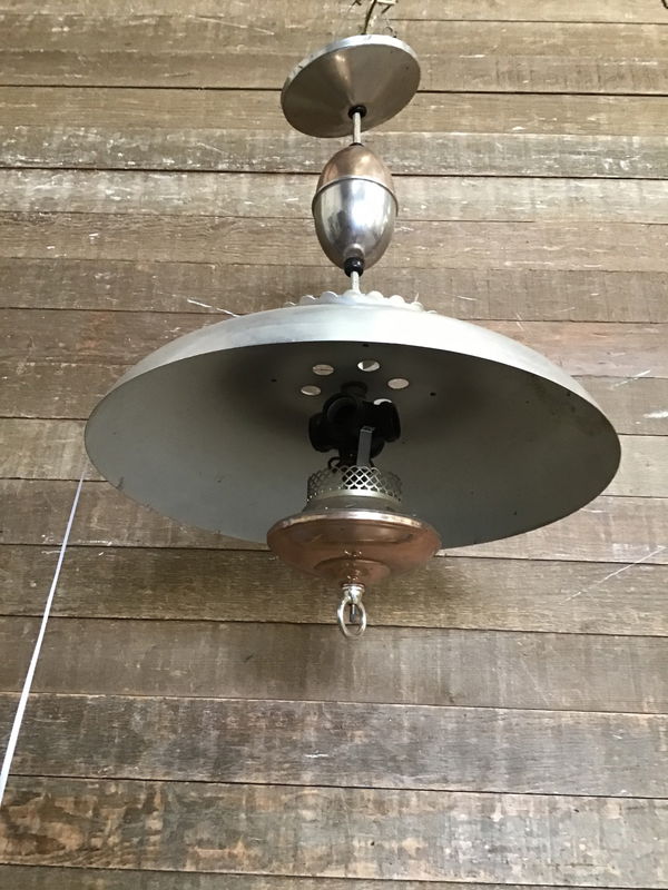 Vintage Sears pull down light with an antique copper finish and a brushed steel finish. The pull down mechanism works as it should. This takes three standard bulbs. Could you a good clean, but wiring looks good. We always recommend a full test prior to installation. Height listed is at shortest length