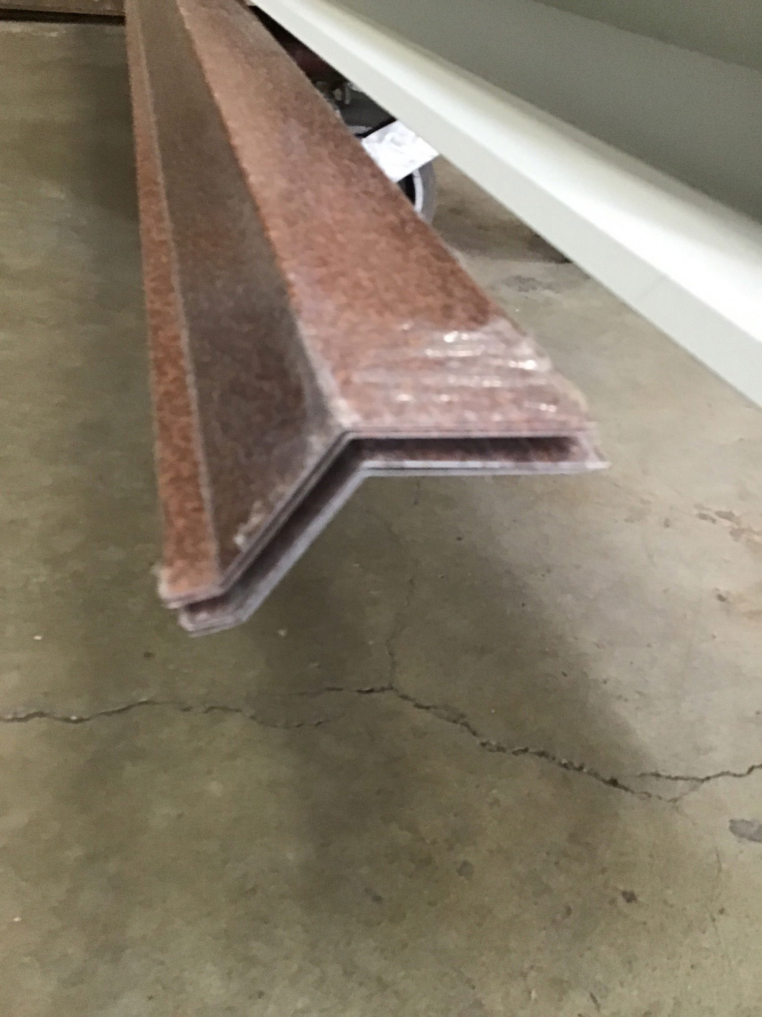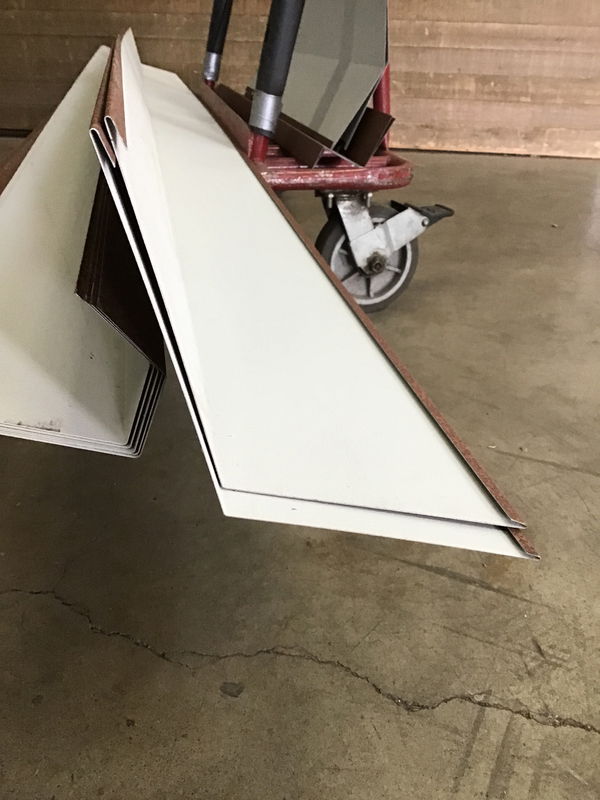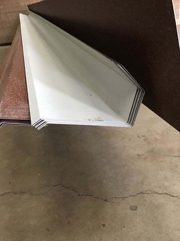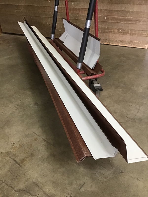 Nice selection of flashing, including three different profiles. These pieces are white on one side and a rust colored finish on the other. These are remnants of a larger project, so there are some cut off pieces included at no extra cost. There are two pieces of corner flashing, five pieces of bottom flashing, and six pieces of apron flashing. The widths vary depending on the piece.
