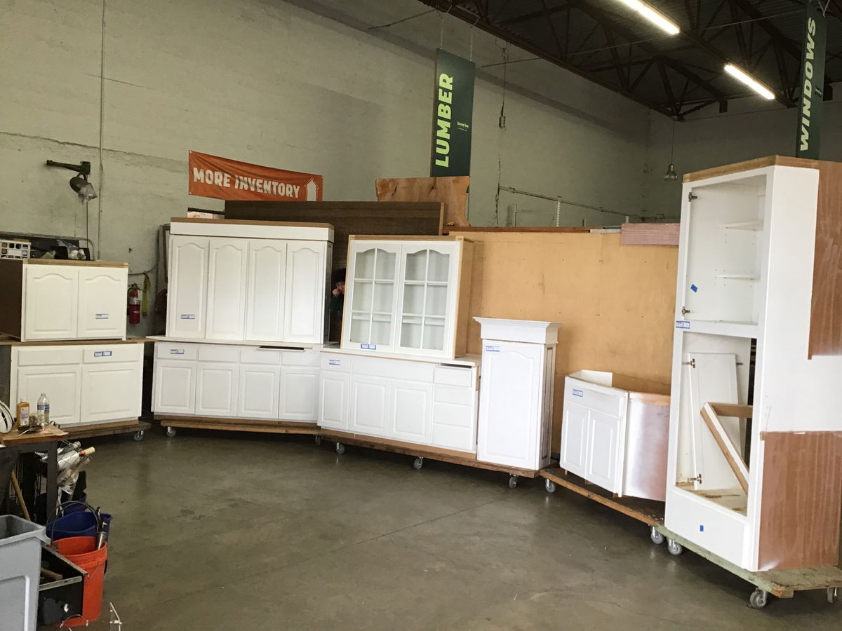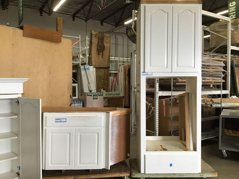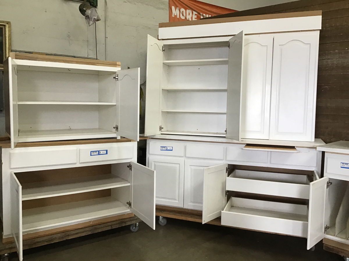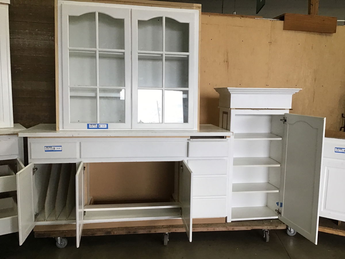 9 piece raised-panel cabinet set painted white with wood face and particle board body, in used but still good condition overall. This cabinet set comes with 4 base cabs, 4 uppers and a built-in appliance cab. There are built in cutting boards, adjustable shelves and pull-out shelves. Does not come with hardware, is missing decorative trim in areas and will need kickboard covers. Also may have some minor dings and paint chipping, but overall in good condition and the price reflects.