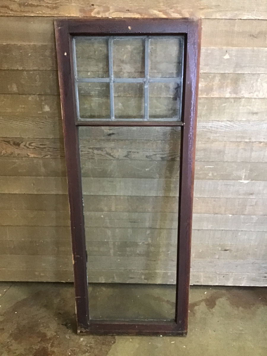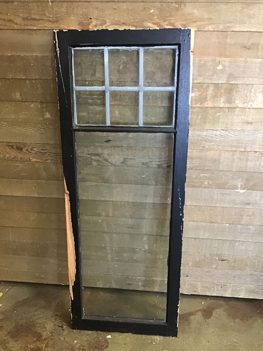 This a nice farmhouse window sash with leaded glass, wooden frame painted black on one side with a beautiful stain on the other side that has an alligatoring finish, with a leaded partition between the true-divided panes and some vintage hardware. Note that this item contains lead. Would be perfect for a cold frame, as porch art, or for a new crafting project!