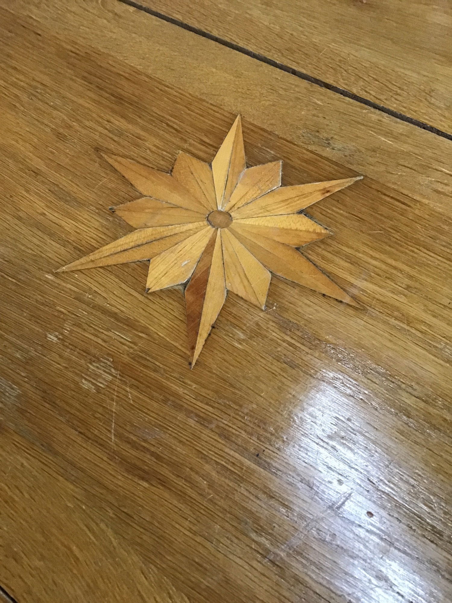Made from solid White Oak with inlayed stars. Has some gaps in the panels from age. I would suggest replacing a couple of the dowels in sits in on the base. Top rests on the base so it will be easier to transport, the top is heavy,