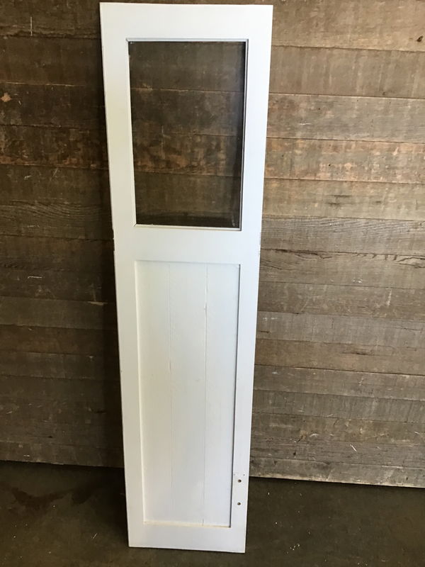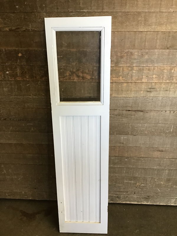 Vintage cabinet door with a single pane of glass and a recessed panel featuring some beadboard underneath.