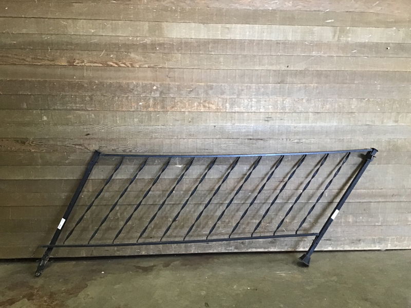 Not up to code, the spindles are farther than 4" apart. One of the posts has been rusted at the bottom so would need to be mounted on something, or just used as a garden trellis.