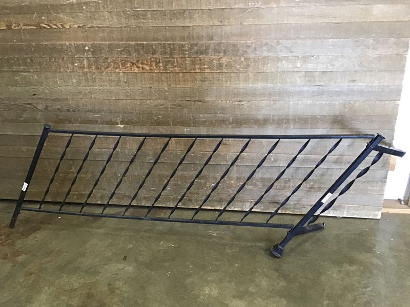 Not up to code, the spindles are farther than 4" apart. One of the posts has been rusted at the bottom so would need to be mounted on something, or just used as a garden trellis.