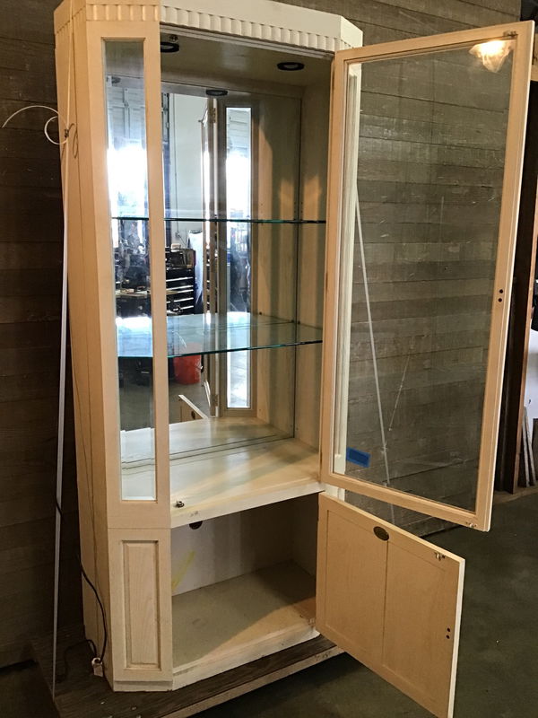This is a very snazzy display cabinet made of oak wood that is painted with a whitewashed stain. It has a full back-cab mirror, two overhead lights that were tested and are functional, neat brushed brass pulls, and there is a small storage space underneath the main cab. There are three glass panes with beveled glass in good condition and two adjustable shelves that come with it as well.