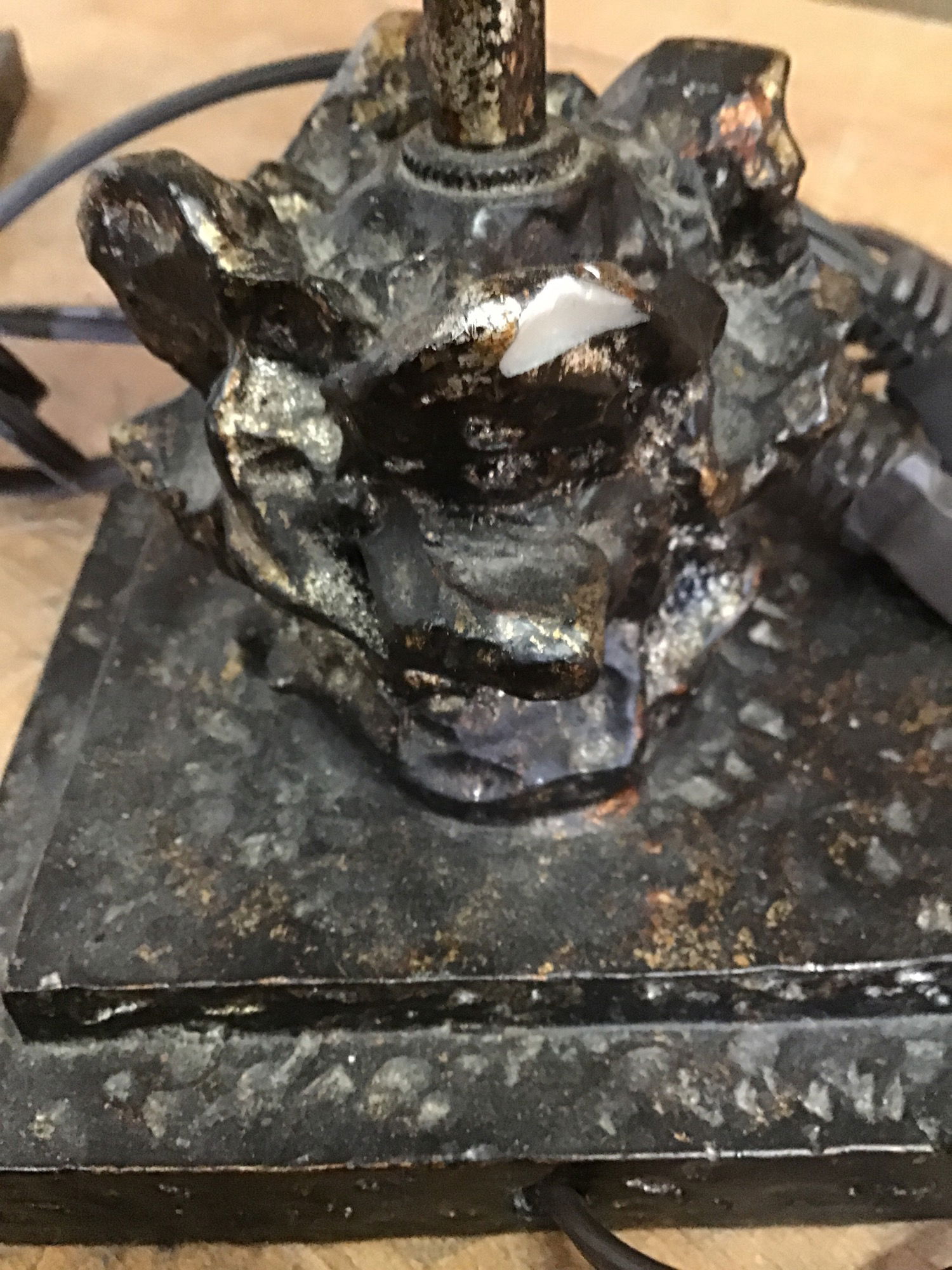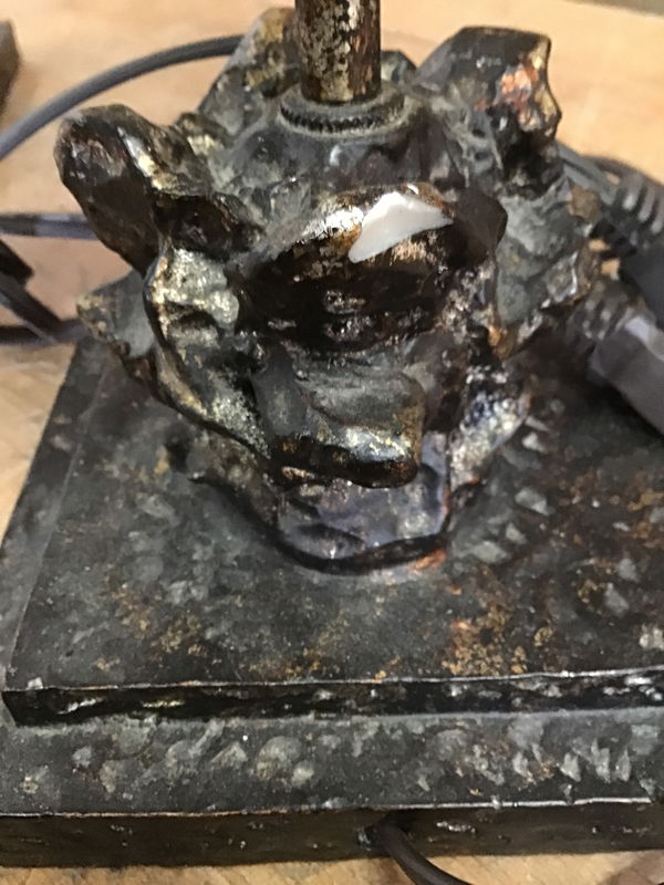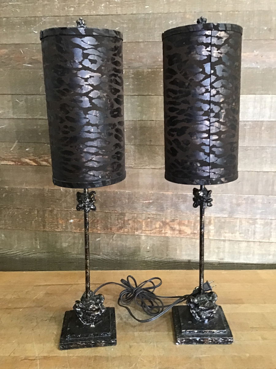 Nice pair of table lamps that have what looks like brutalist, raw ore-inspired base and finials. Both come with lamp cloth lampshades. Tested in house and appeared fully functional. There is a small chip in one of the bases, price reflects.