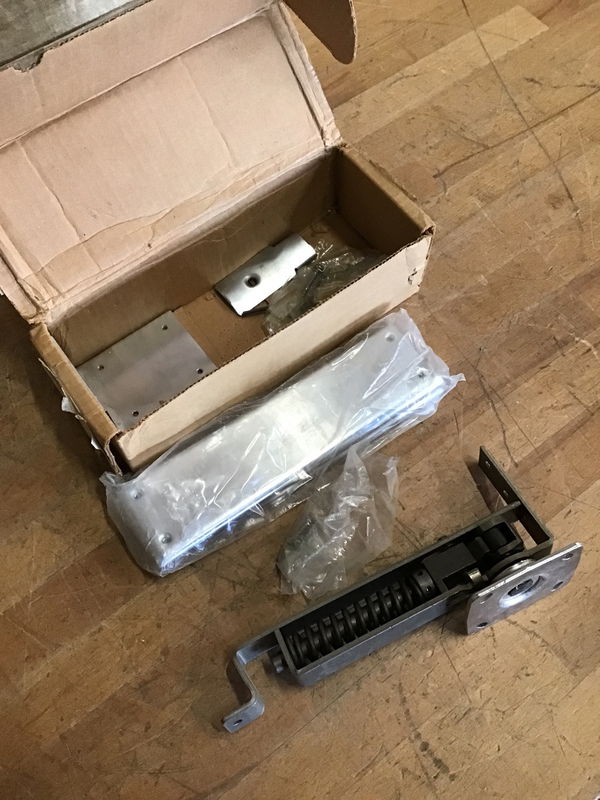 Bommer double acting horizontal spring pivot model 7812 butler door hinge. Never installed, packaging seems to have necessary installation hardware.