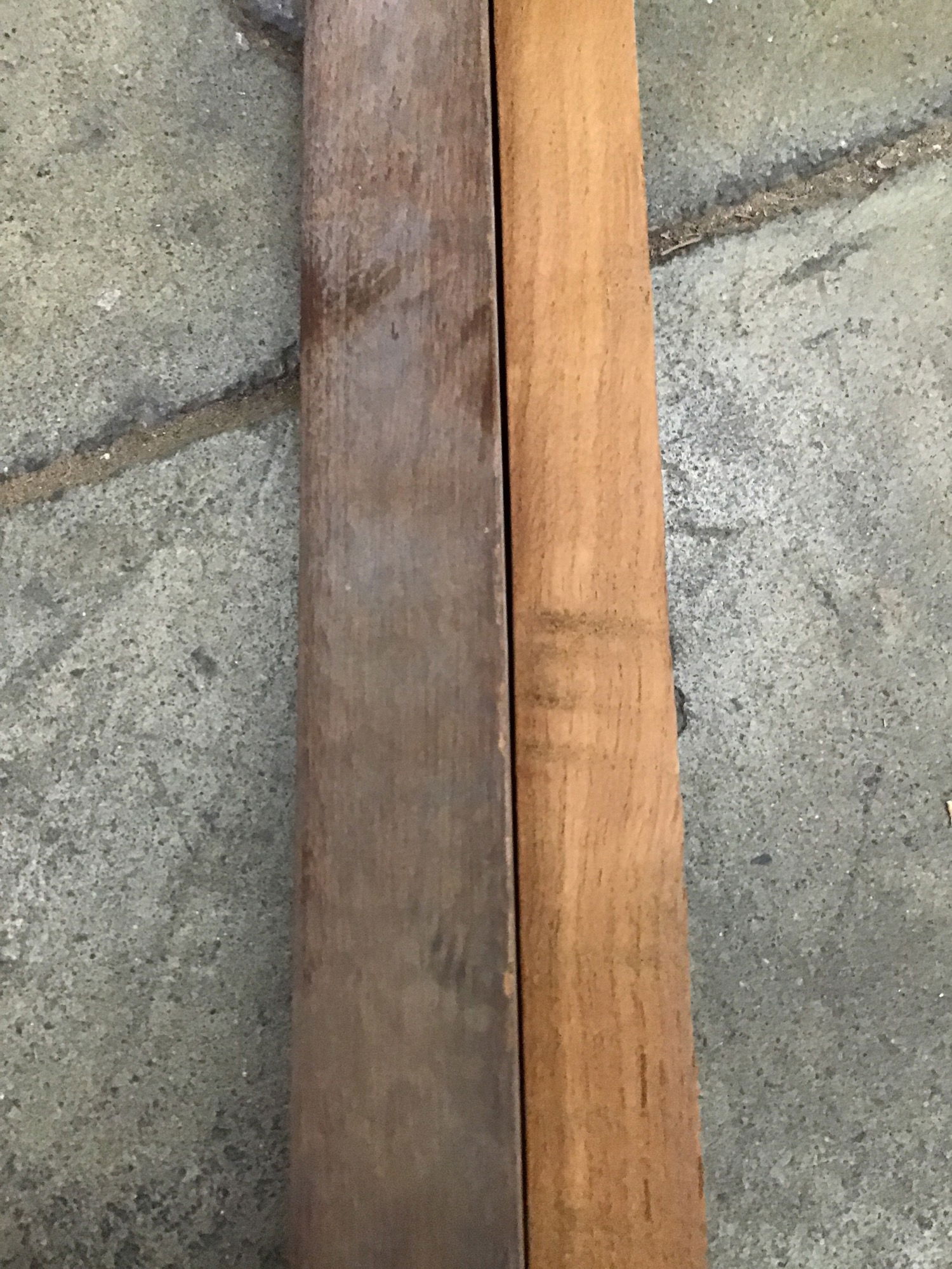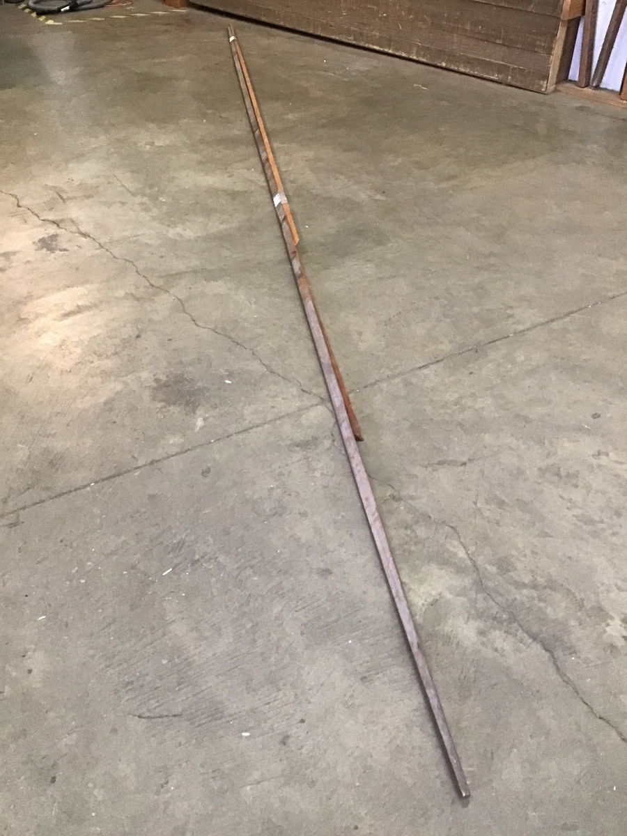 Vintage thin planks of wood (marked Teak) that look similar to milled follower planks originally used to construct canoes from the Willits Brothers original shop. These are unmarked, so we are unsure what they were originally used for. Great pieces of wood good for projects outside of boats! Width and thickness varies but is generally 1" x 1.25" with a triangular cut and tapers at the ends, there are three pieces measuring 171", 207", and 132" in length for approximately 42.5' linear feet.