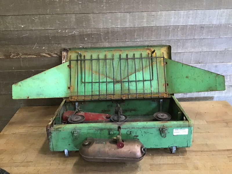 Coleman 3 burner camp stove with a spare fuel tank. They both pump but probably don't hold pressure. Will probably need seals and gaskets replaced and a good wire brushing. Has some rust but metal is still strong and not falling apart.