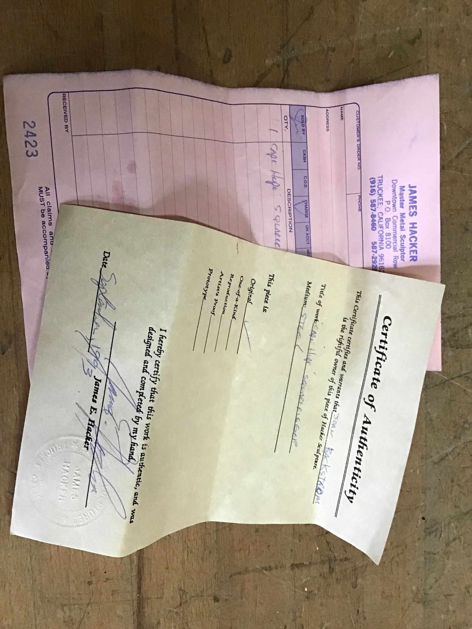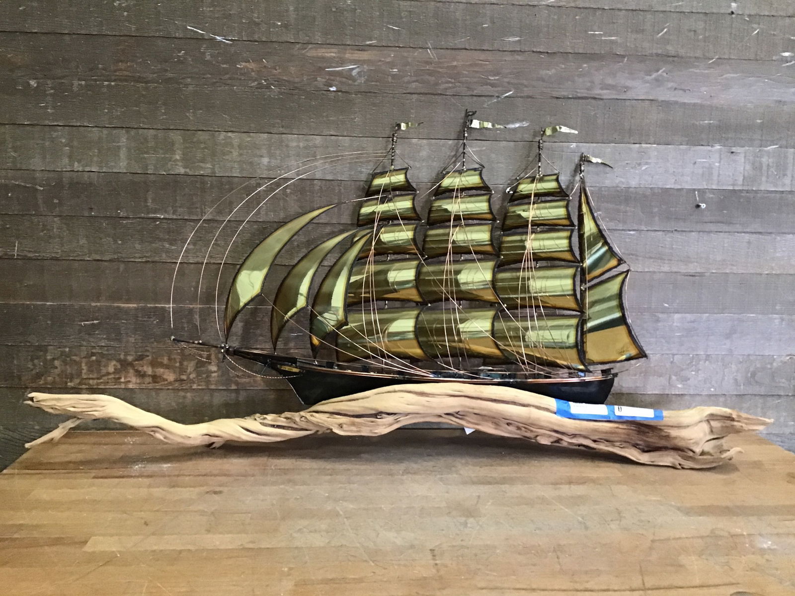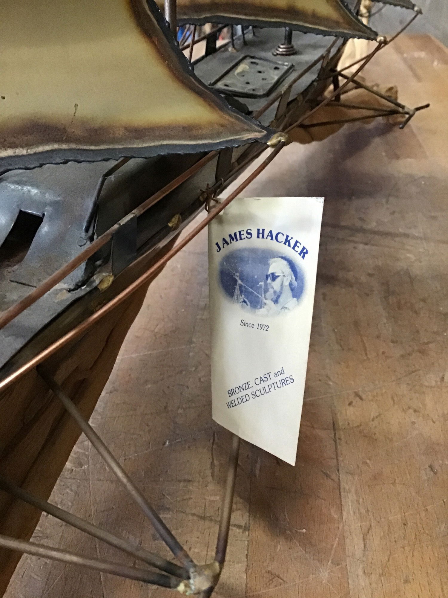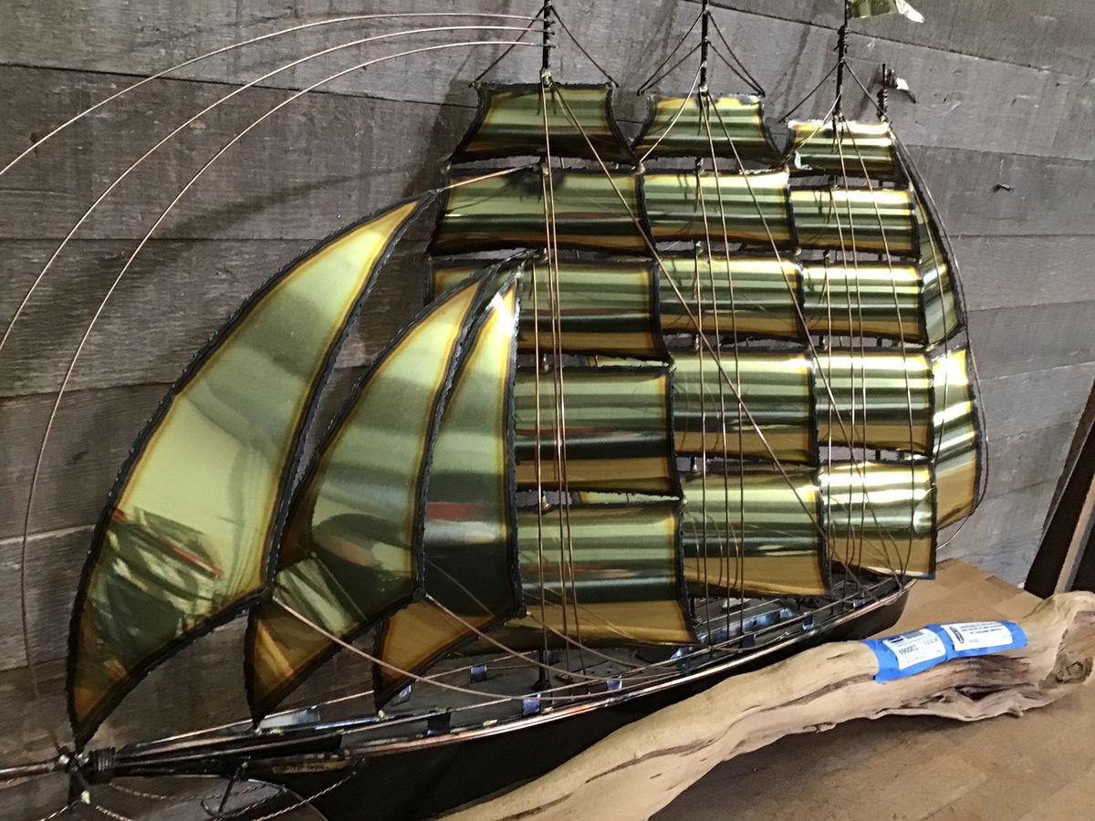 This is a one-of-a-kind brass and metal sculpture of a ship called "Cape Hope Square-rigger." This came to us with the original artist tag, bill of sale and certificate of authenticity, and from that we can see that it was built in 1993 from metal sculptor James Hacker. This is the only model that was made and it is still in pristine condition, with all of the brass and metal flourishes still in great shape as well as the piece of driftwood that it is seated on. Would be an absolutely stunning piece for a mantel, desk or wall space, especially for all you nautical aficionados! Measurements listed are rough and account for driftwood base, and the price reflects it's rarity, age and condition.