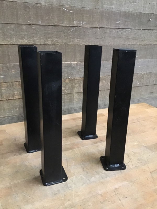 Locally fabricated by a family operation. Made from welded tubular steel and very heavy duty, great for a chunky wooden bench top. Missing its rubber footpads so would be suitable for an outdoor table.