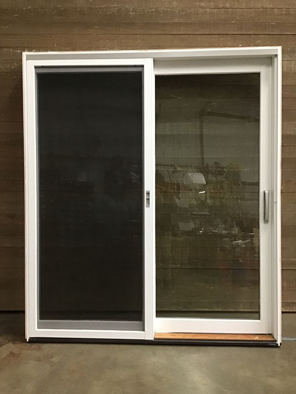 Exterior Pella aluminum clad wood sliding door with one screen and one sliding door. Unsure of age but glass and frame looks great.