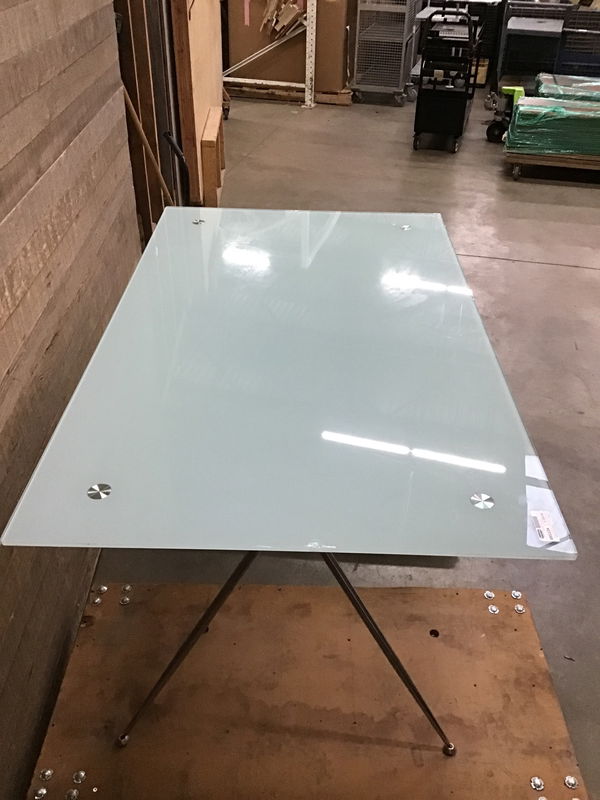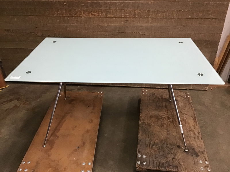 MCM styled Glass Table. Chromed steel legs, and an aqua glass top. Table base has some rust corrosion but could clean up easily. Glass top has a small chip on one of the edges.