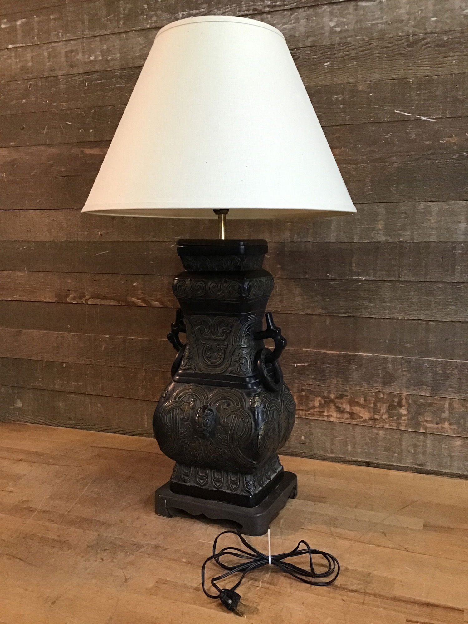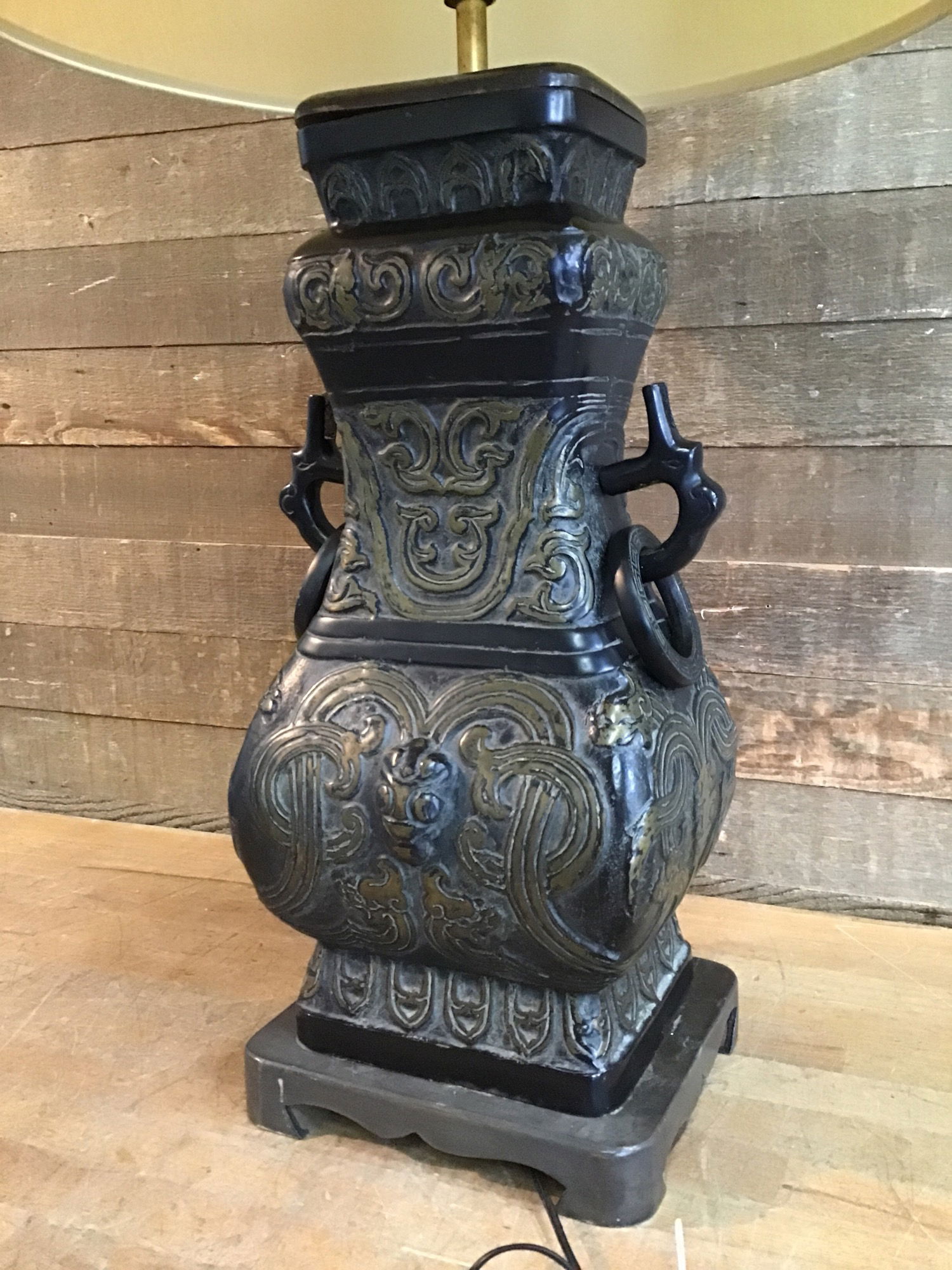 James Mont style Chinese wine vessel lamp, midcentury. The "vessel" is cast brass with dramatic designs. The wood piece on top of the vessel is slightly bowed. This type of lamp lists for $300-1000+ online.