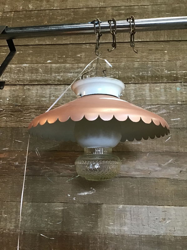 Has a semi-flush mount style fixture but with hanging hurricane chandelier style. Wires are that old cloth style so drop in a new lamp socket before installing!