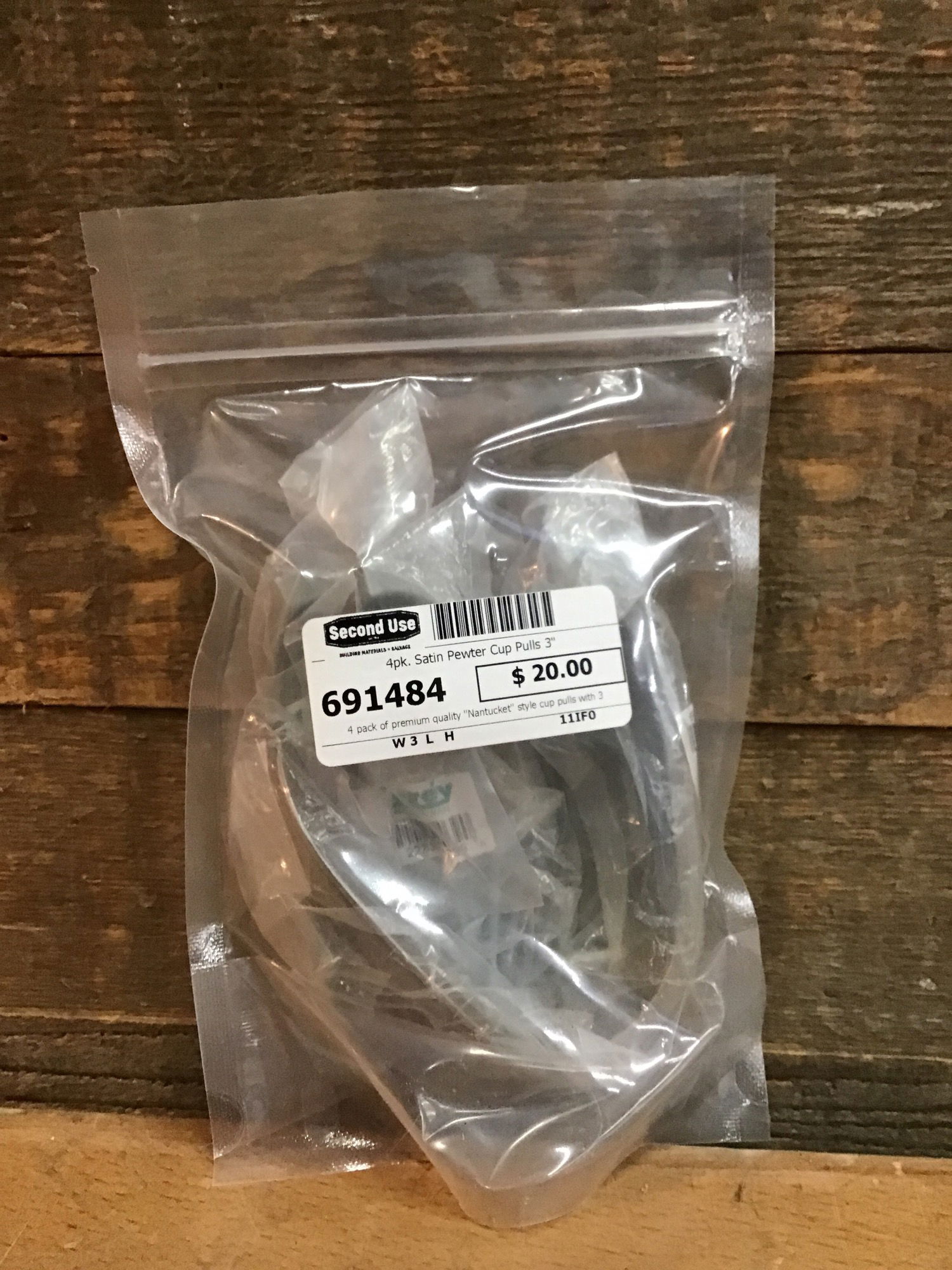4 pack of premium quality "Nantucket" style cup pulls with 3" center to center mounting holes and a satin pewter finish. More info on these here, they seem to retail for around $20 a pop.