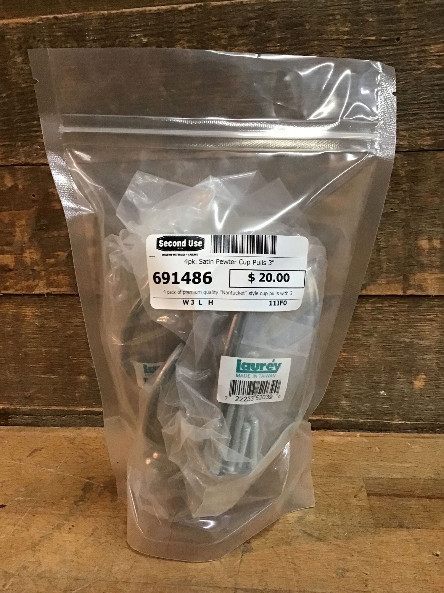 4 pack of premium quality "Nantucket" style cup pulls with 3" center to center mounting holes and a satin pewter finish. More info on these here, they seem to retail for around $20 a pop.
