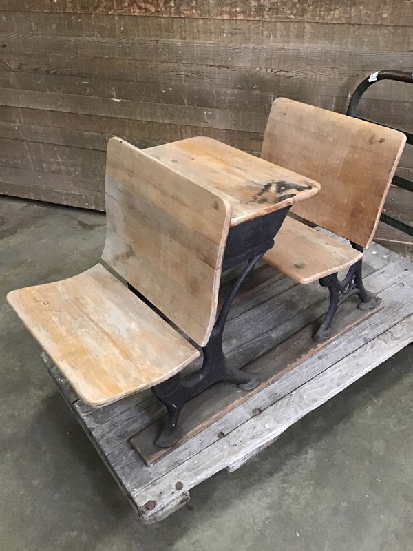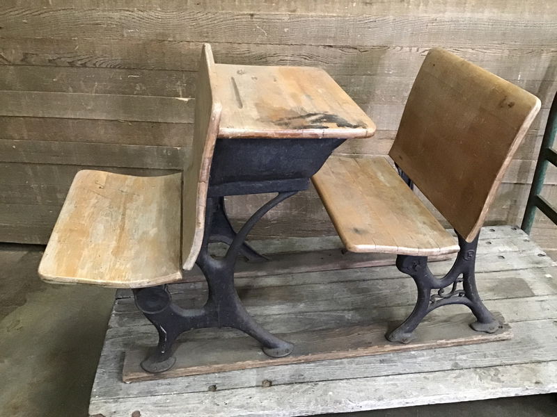 Old children's school desk with cast iron legs and two wooden benches. There's a bit of wear/graffiti on the wood, but is in overall good condition. Great as vintage decor! Measurements listed are for overall footprint.