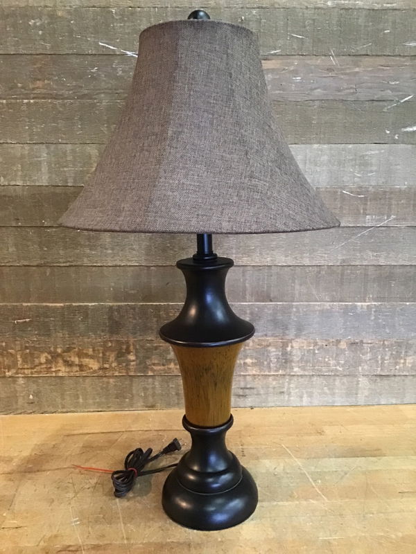 Super nice and modern table lamp with a oil rubbed bronze finish and a pretty amber glass center. Comes with a brown fabric shade. Tested in house and works great. Dimensions include shade.