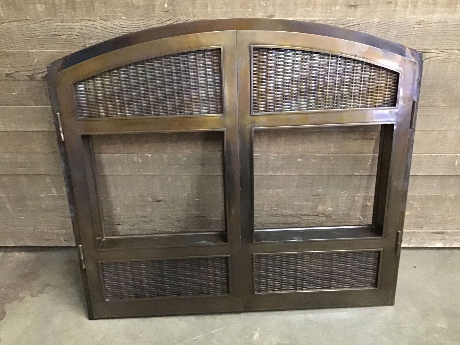 Feast your eyes on these gorgeous brass arched fireplace doors! Features woven brass panels. Some oxidation and patina from heat, which add to its vintage charm. It did not arrive with glass panes or metal screens. This piece is worth its weight in brass alone!