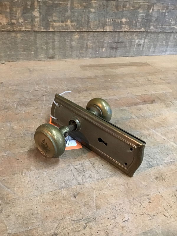 Vintage brass door knob set with matching door plates. They have been cleaned pretty well with just some small paint splotches left over. Have a nice authentic patina.