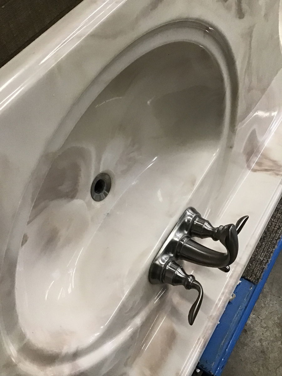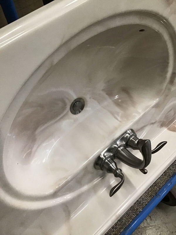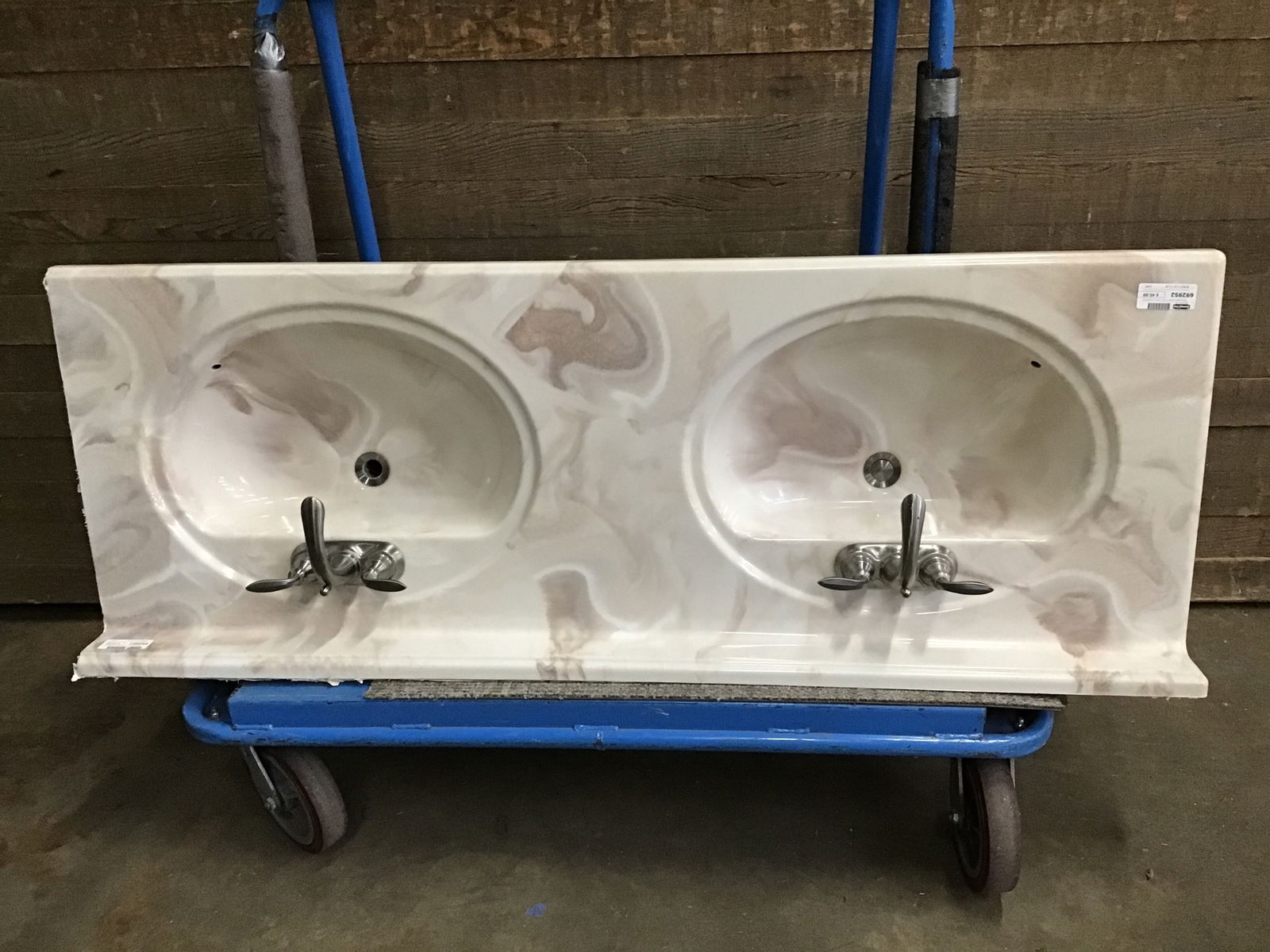 Comes with matching sinks and brushed nickel finish pfister faucets. In good used shape with no major scratches.