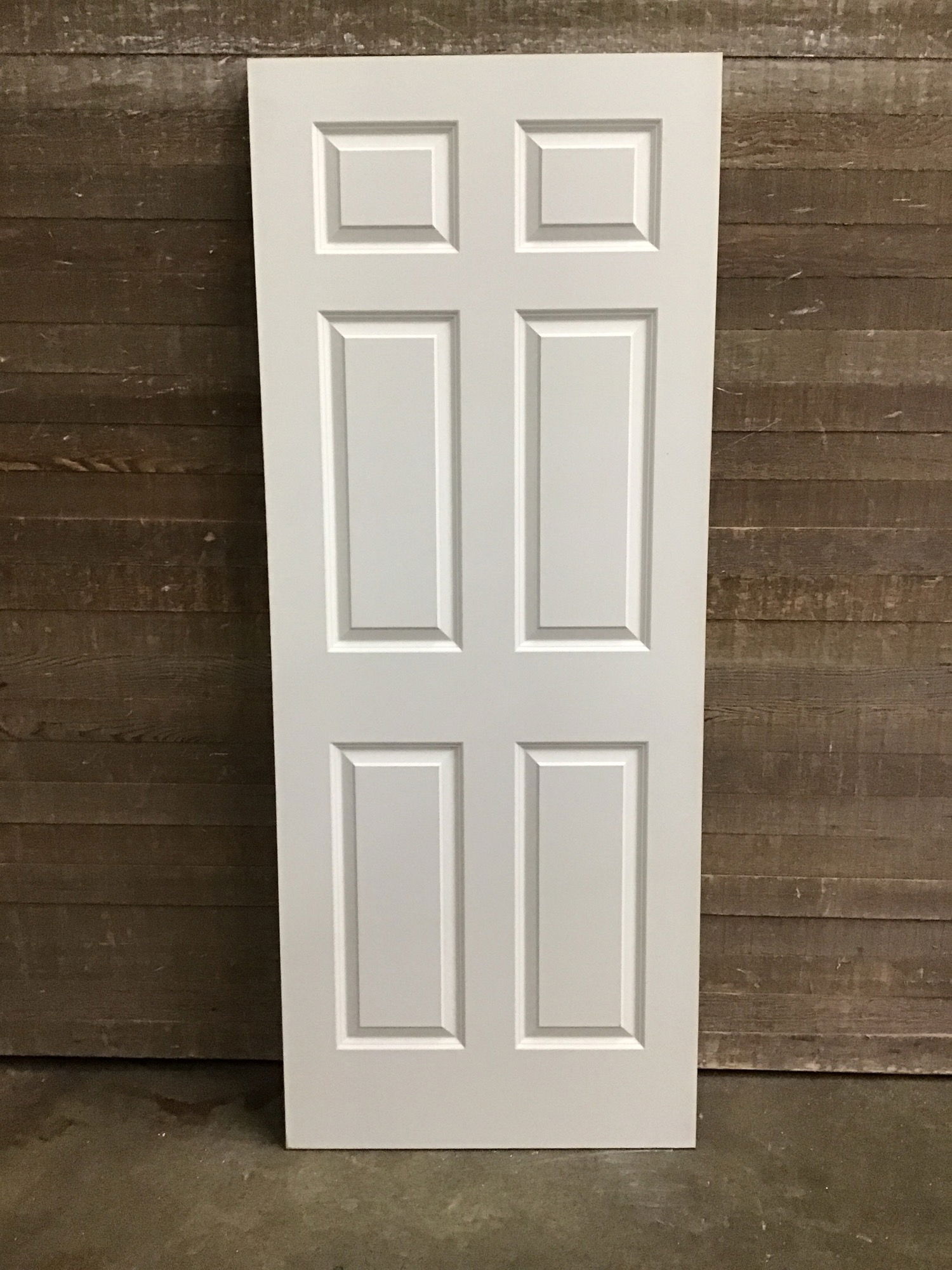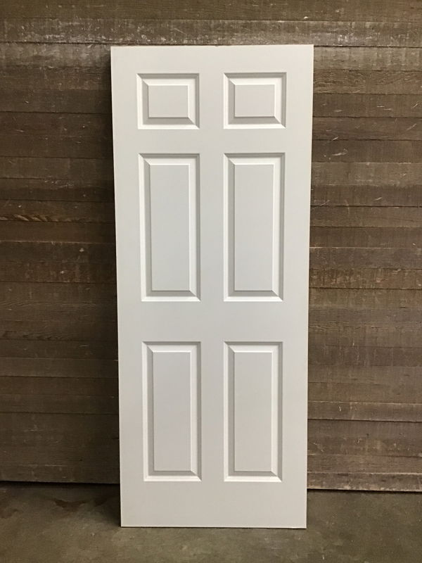 Primed solid core faux 6 panelled door. In great shape and never installed. May have some small cosmetic bumps and scrapes but in overall great shape and will look fine after its first paint job.
