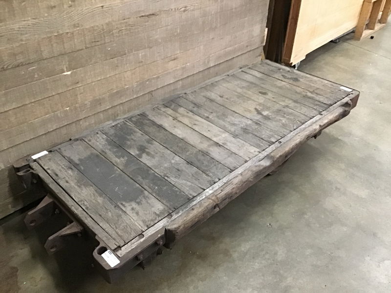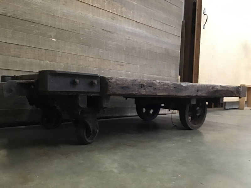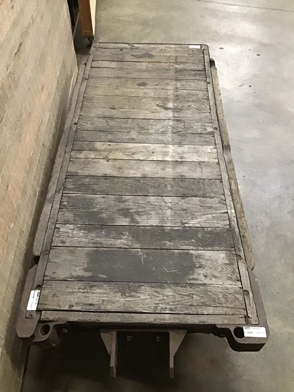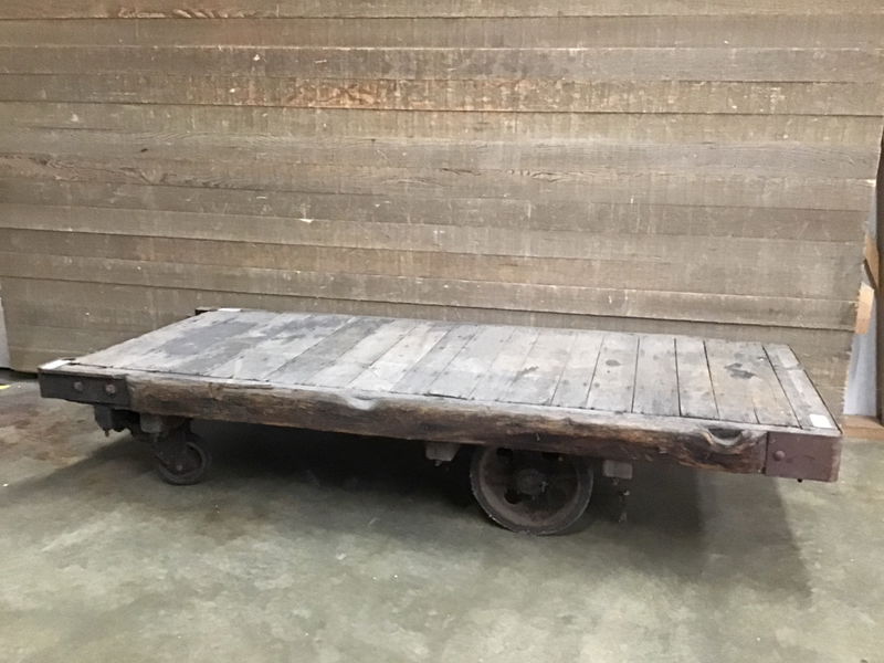 This cart has so much character. Weathered wood frame with cast iron wheels/casters. Sits level and great size for a rustic coffee table project.