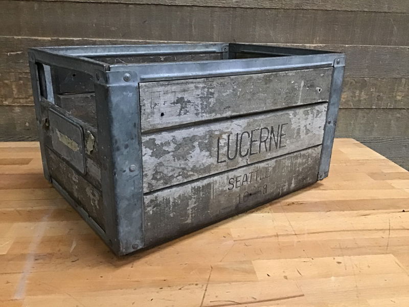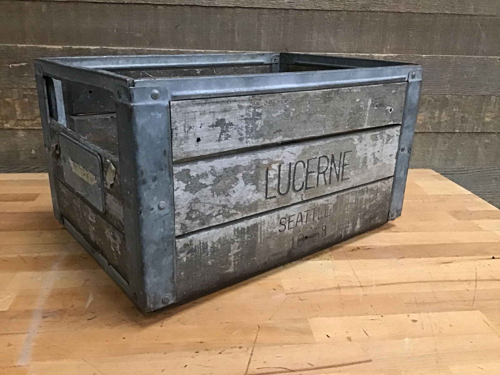 Lucerne Seattle milk crate dated to the late 50s. Missing a wood piece on one side and has a split at the base but could make a killer planter or other decorative yard thingy.