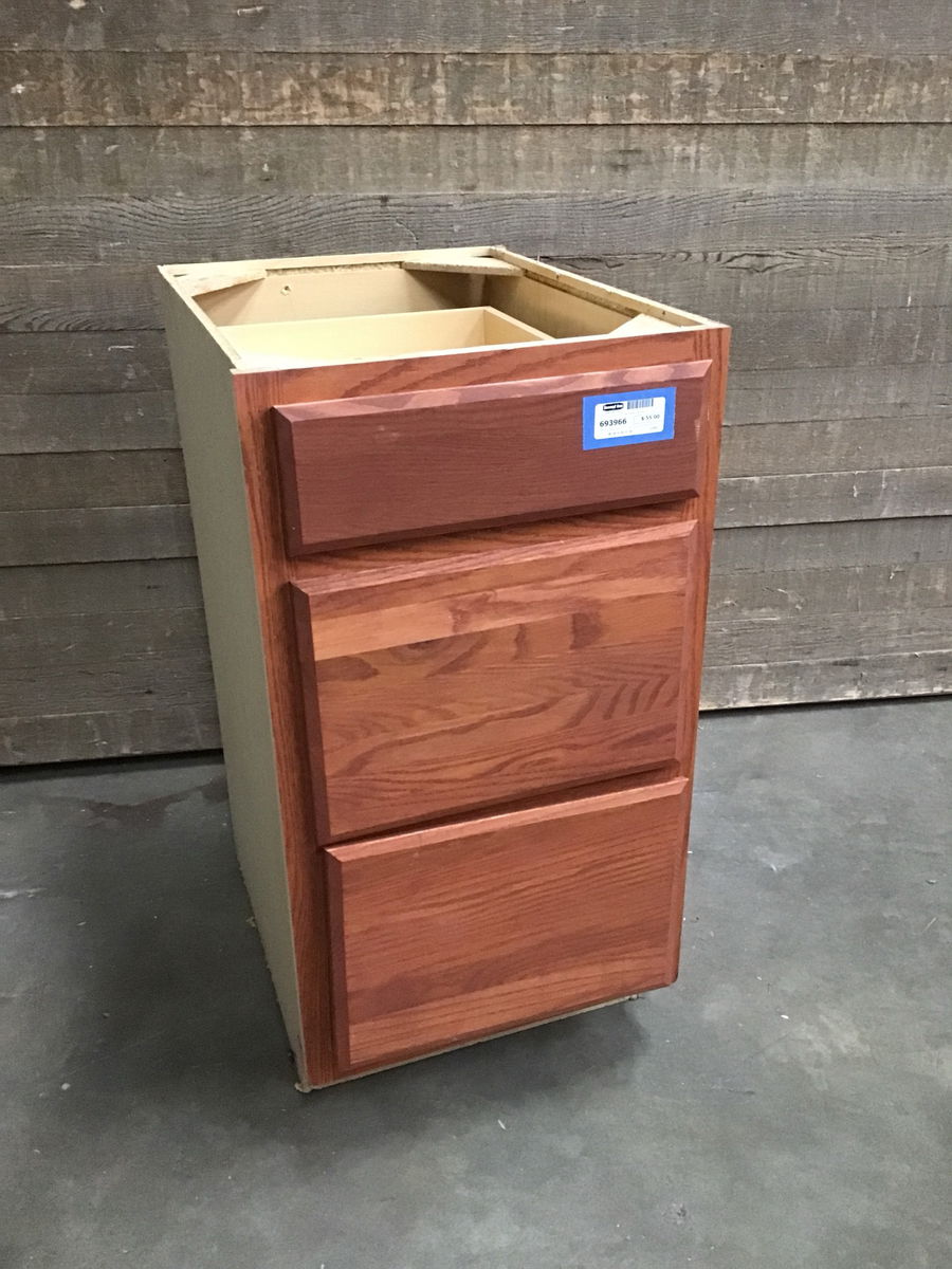 Oak base cabinet with three drawers. Particle board box, and a red toned stain. May have some minor cosmetic damage, but is overall in good condition.
