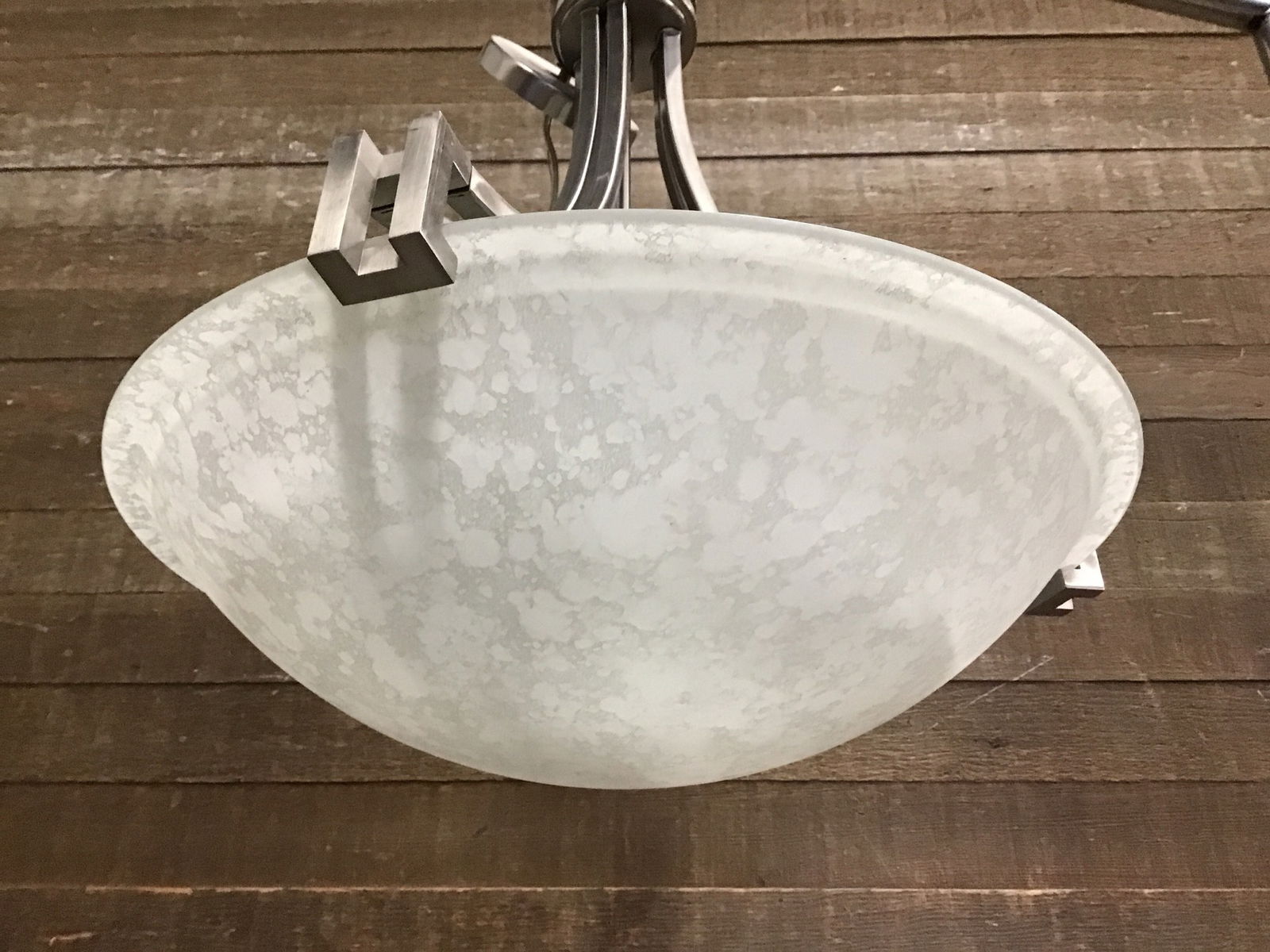 Modern chandelier with a brushed nickel finish, frosted glass bowl shade, and frosted glass panels to defuse the three bulbs. Manufactured in 2010, these are dusty but in good shape. Wiring looks great but we always recommend a full test prior to installation. Photo may be representative. Measurements are approximate.