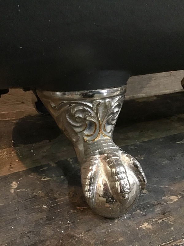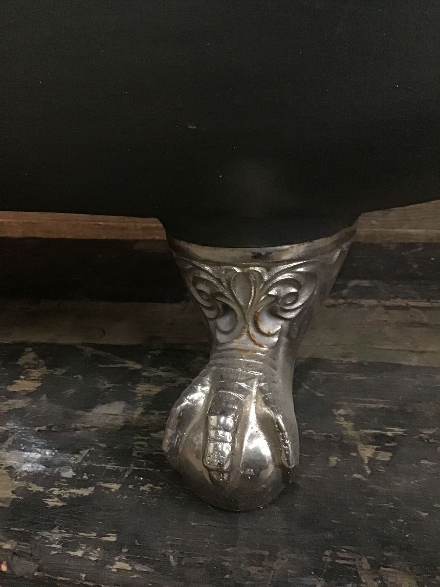 Vintage cast iron clawfoot tub featuring a dark grey painted exterior and 4 stunning chrome plated claw foot tub feet. Includes a faucet is missing its "cold" handle. Looks like it was previously refinished and has a couple small chips and dings here and there. Overall stands nice and sturdy and is ready to bathe.