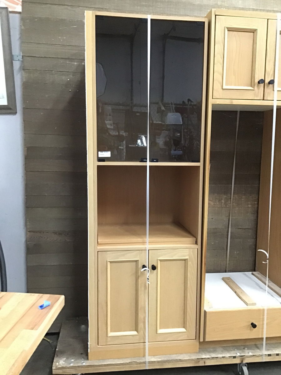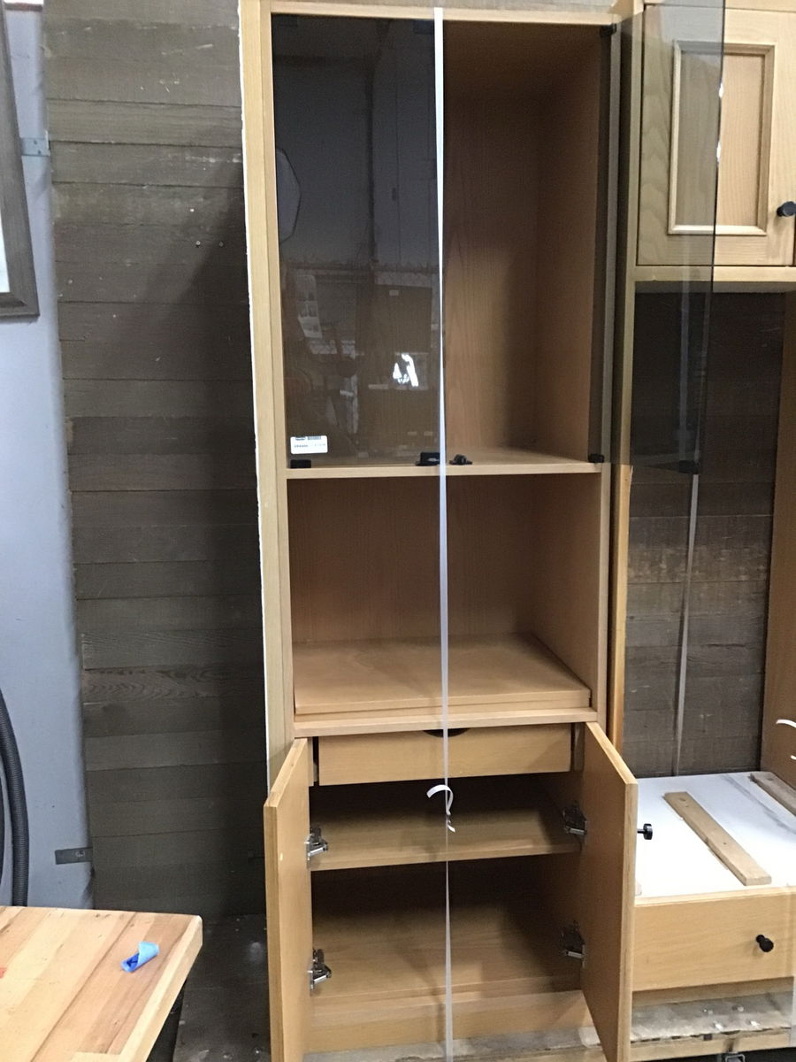 Media cabinet in good, used condition with a light stained Oak face, nice plywood box. Top half has two shaded glass doors, and bottom half has two wood doors with a pull out drawer. There are three adjustable shelves. Would be a good cabinet whether in a kitchen for pantry storage, or as office/media storage. One of the magnetic bits on the door has come loose and needs to be resecured.