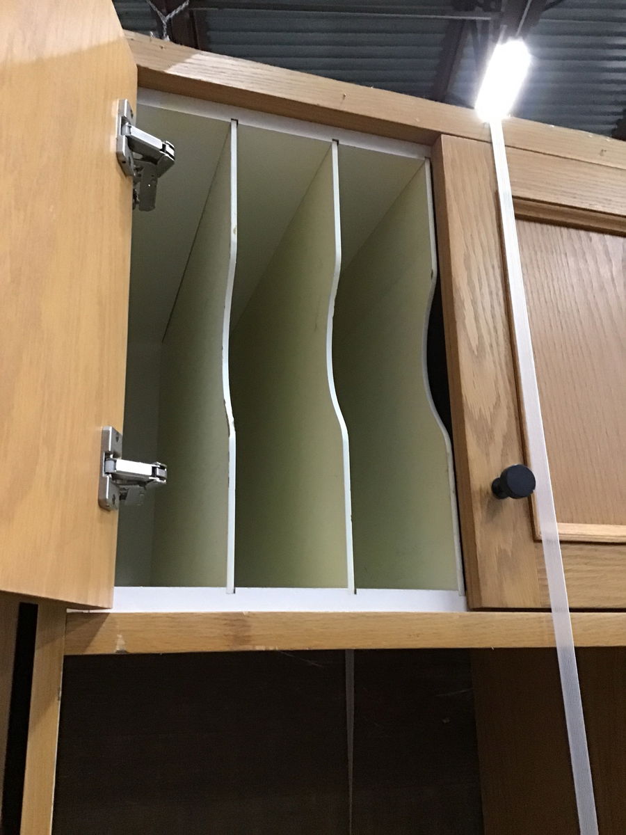 Nice wall oven cabinet in good, used condition with a light stained Oak face and plywood box. Top has two doors with vertical slats for tray storage and bottom half has one drawer. Rough opening for appliance is 25.5"W x 50.5". There is a little damage to the trim in the top left corner, price reflects.