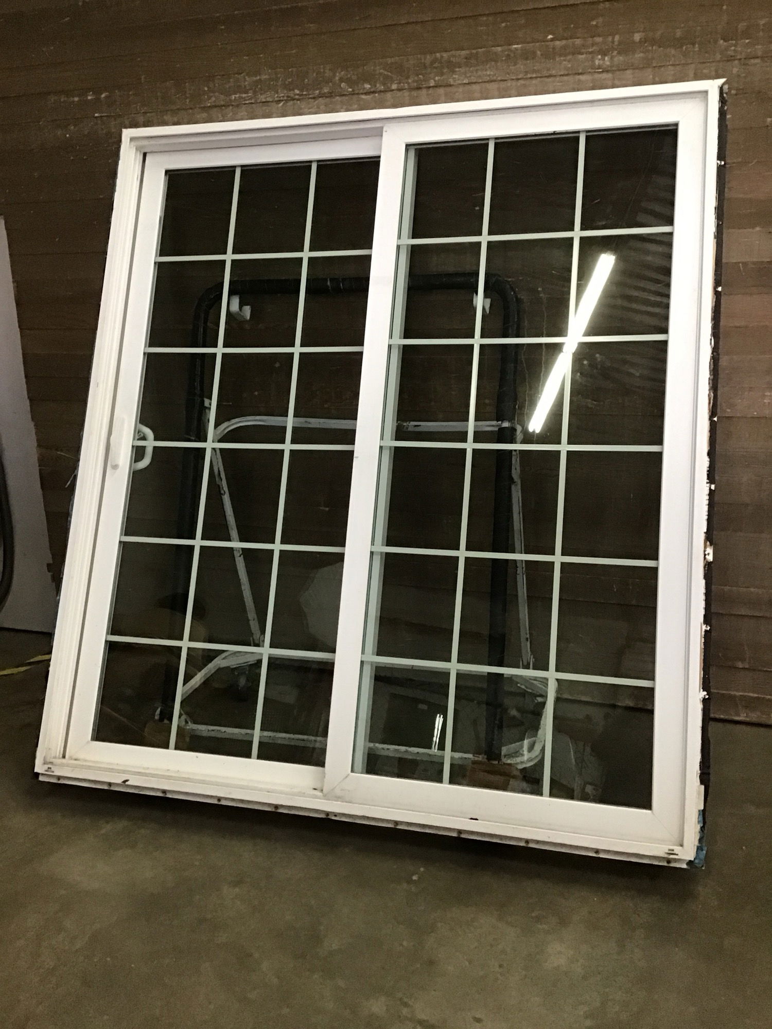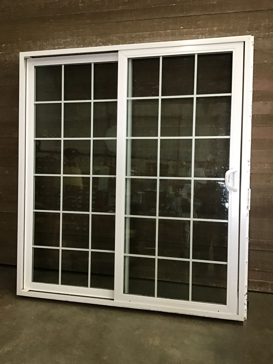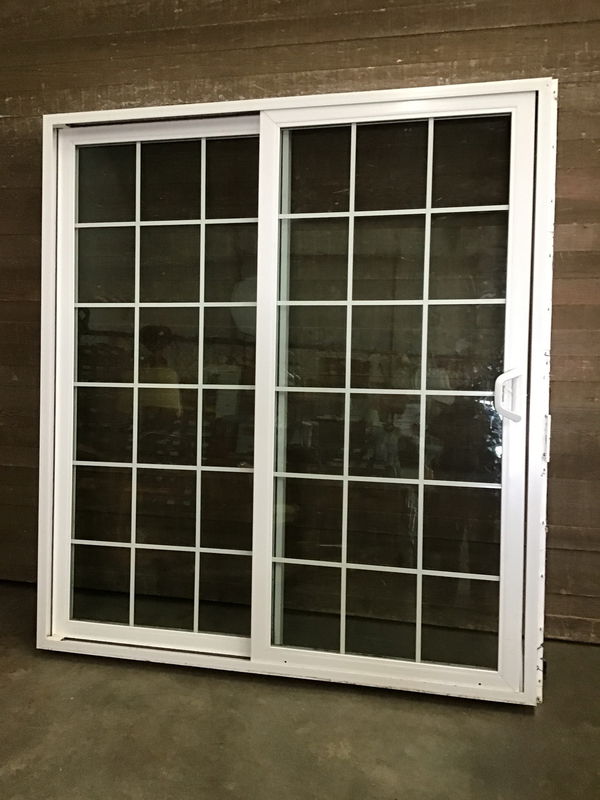 Exterior white vinyl sliding door with 6x6 faux divided panes of glass. Seals look good and includes nailing fins, and the latch catch is included.