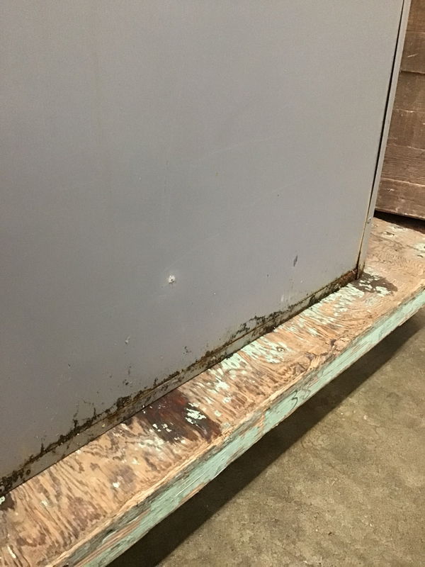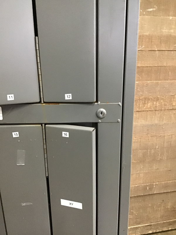 8-compartment "uniform" locker w/ 1 master door. It has a bit of rust spots and obvious signs of its past life. Some locks are a bit jammed and they dont all come with working keys. HOWEVER!!! Its still stands nice and proud. It would make a nice art storage locker after a bit of a clean up. You can remove the doors and make it into a cubby cabinet kinda deal.
