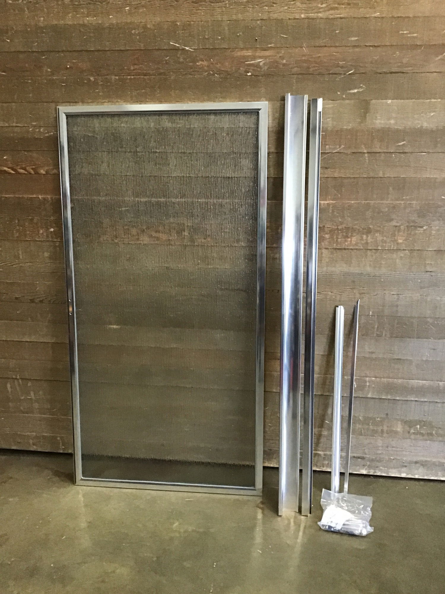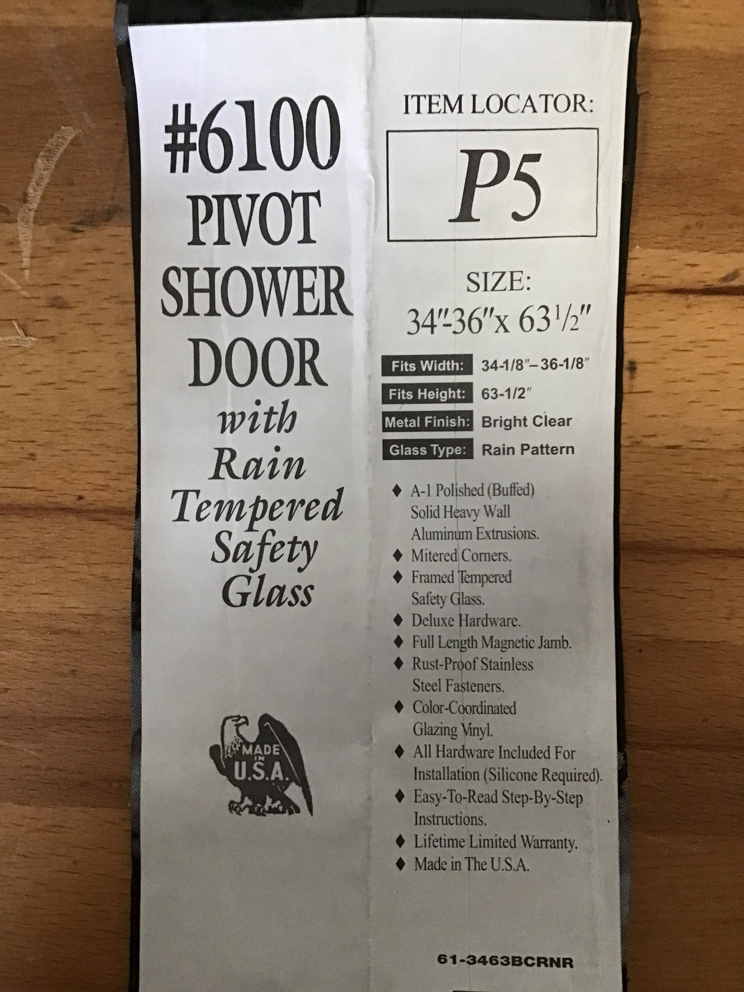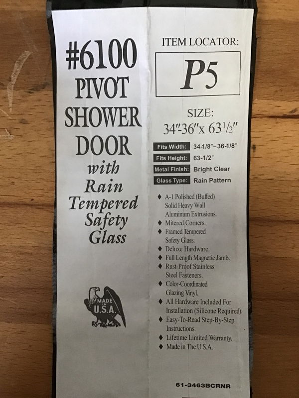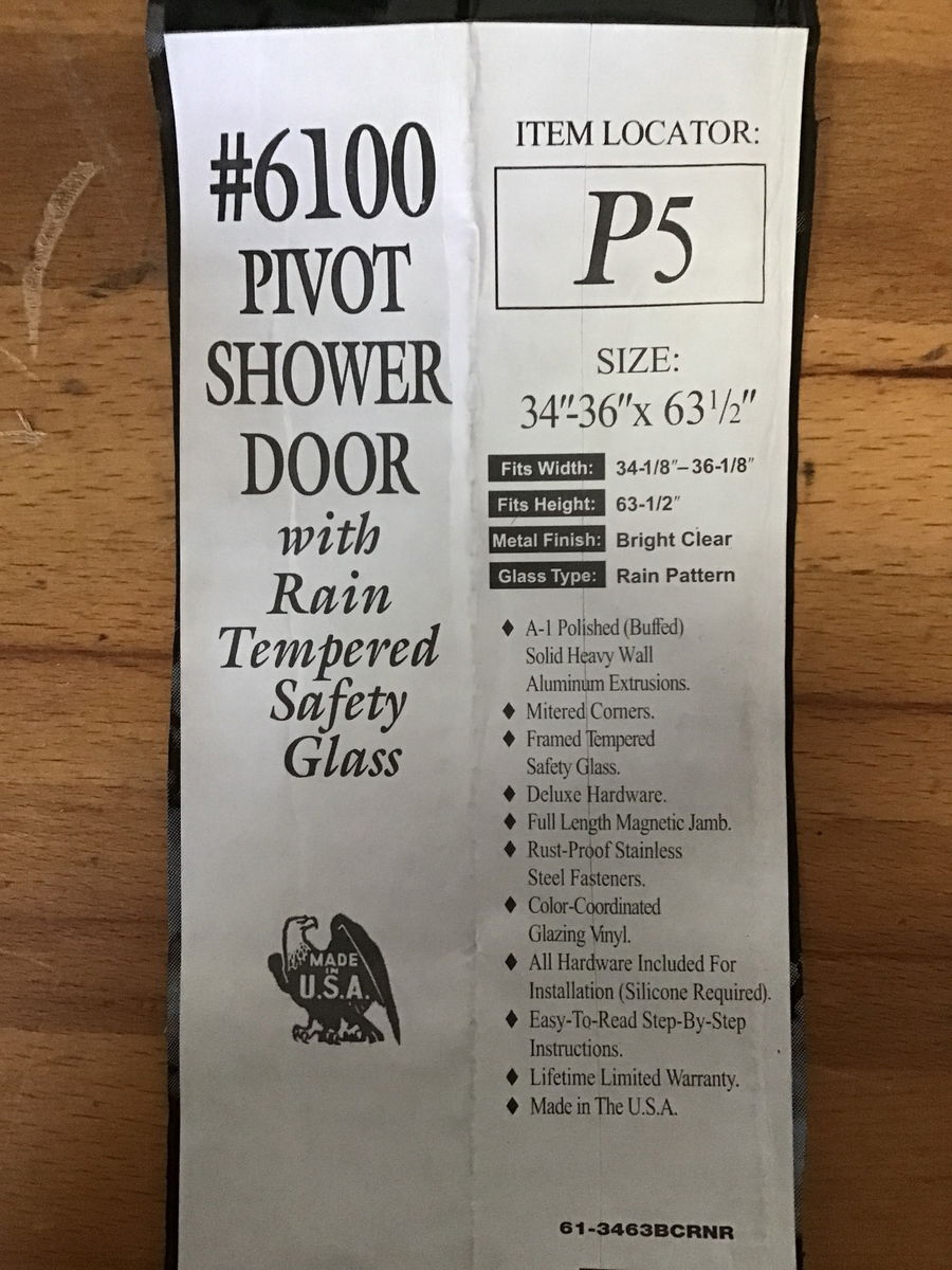 New, never installed pivot shower door with rain tempered safety glass. This came to us new in box and comes with hardware and frame, available in back upon purchase. Width fits 34.125"-36.125" and fits height 63.5"