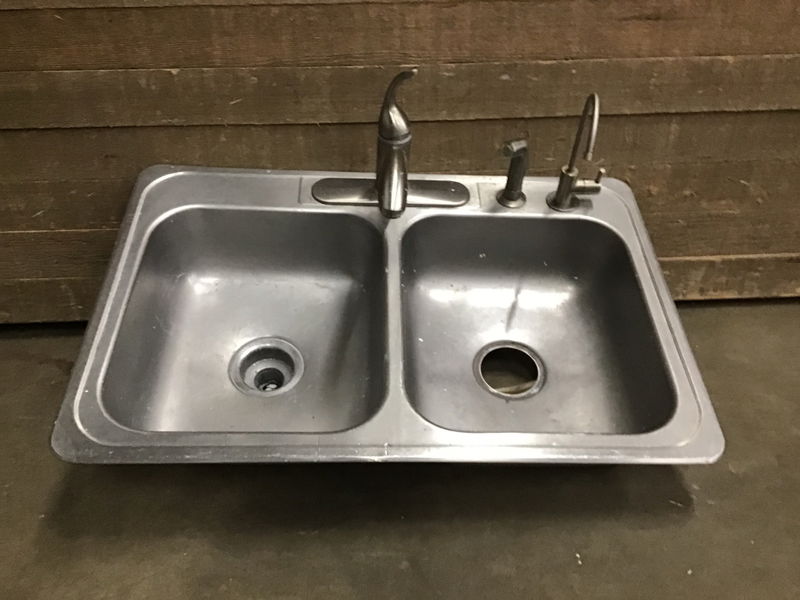 Stainless steel kitchen sink with two bowls, faucet, hose, and hot water faucet attachment. May be some minor cosmetic damage, but is in good usable condition. Could make a great garden or laundry room sink.