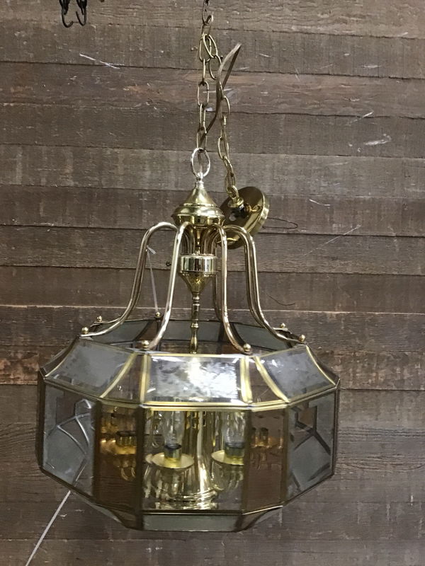 Beautiful chandelier featuring brass construction, beveled glass and glue chip etching.