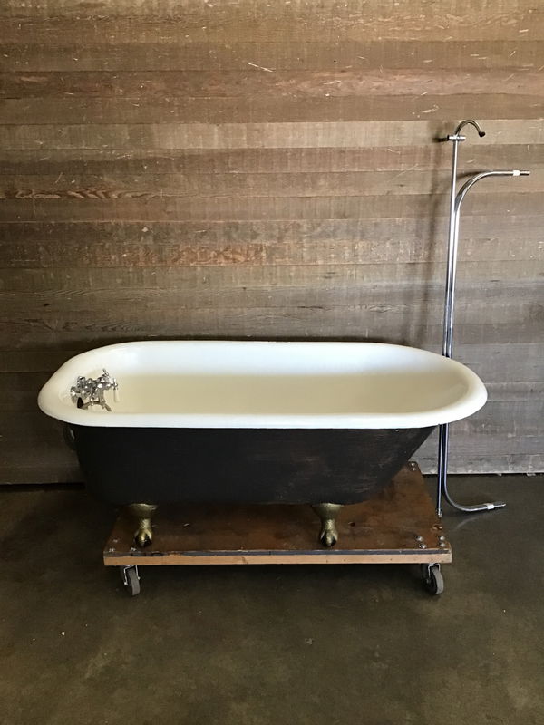 5' cast iron tub with 4 sturdy clawfoot feet. Includes a stunning chrome faucet with porcelain handles and its original shower ring. Looks like the previous owner started painting the exterior but stopped. Searched everywhere for major rust or chips and found only minor dings, a small chip to its enamel and a bit of rust near faucet. Overall tub is in good condition and have tons of life left to live.