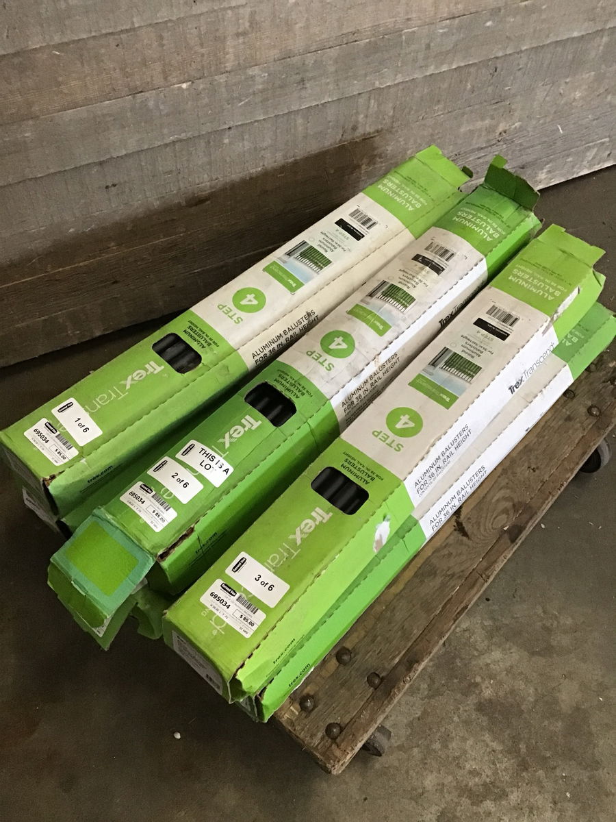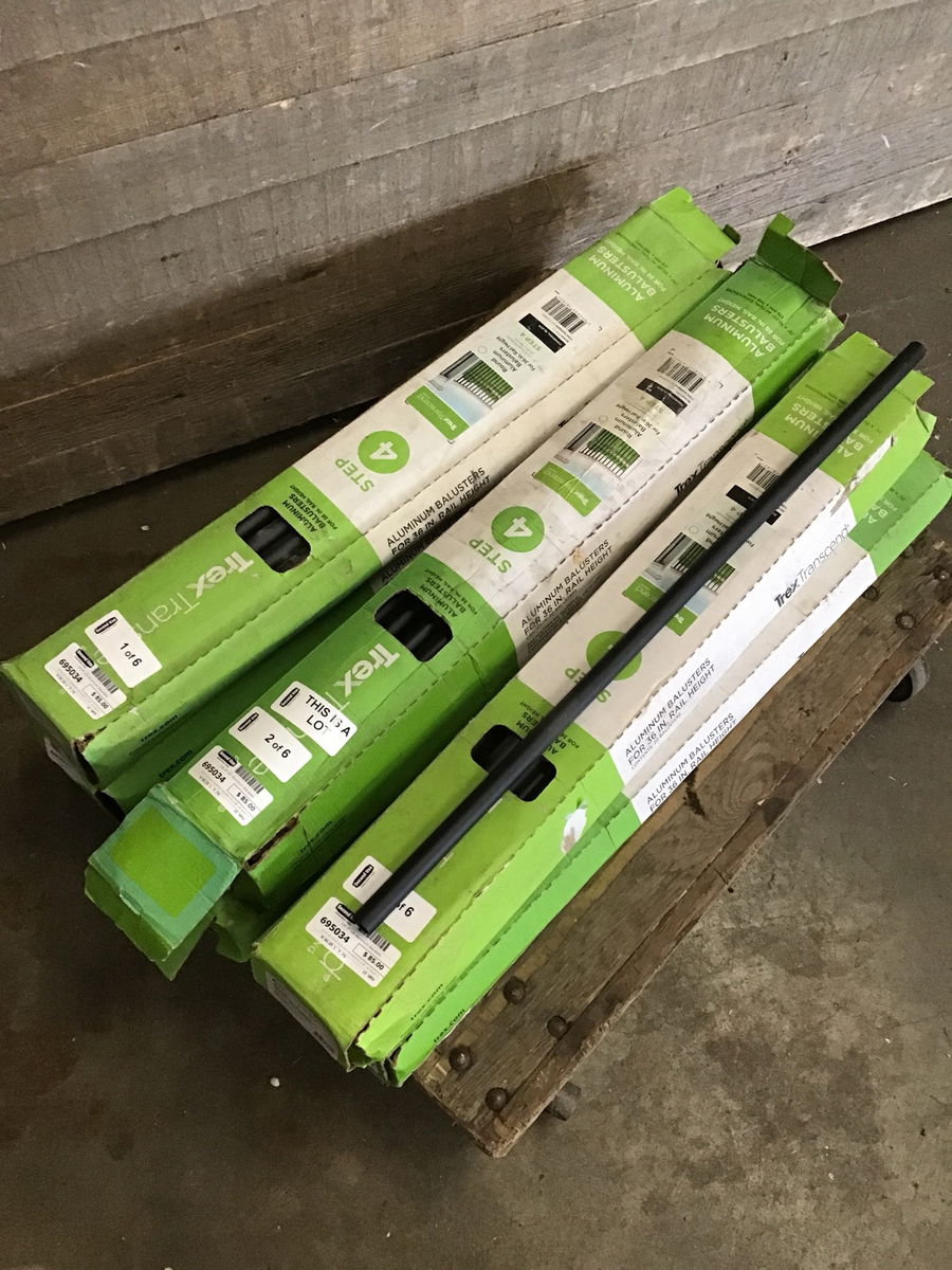 Lot of 120 round aluminum balusters for a 36" rail height. Charcoal black finish. Each box has 20. Never installed. Manufactured by Trex Transcend.