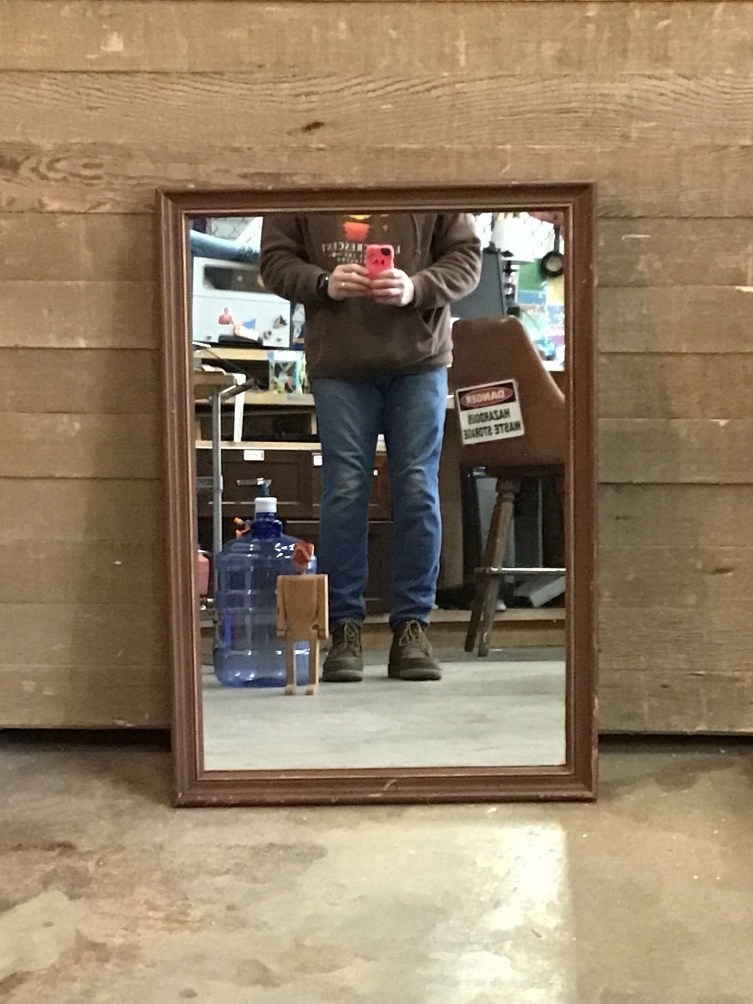 This wood framed hanging mirror will bring some character into your home. It's sturdy, heavy and still works just great. It has a wood back and appears to have been painted a few times. It has come cosmetic patina around the edges, price reflects.