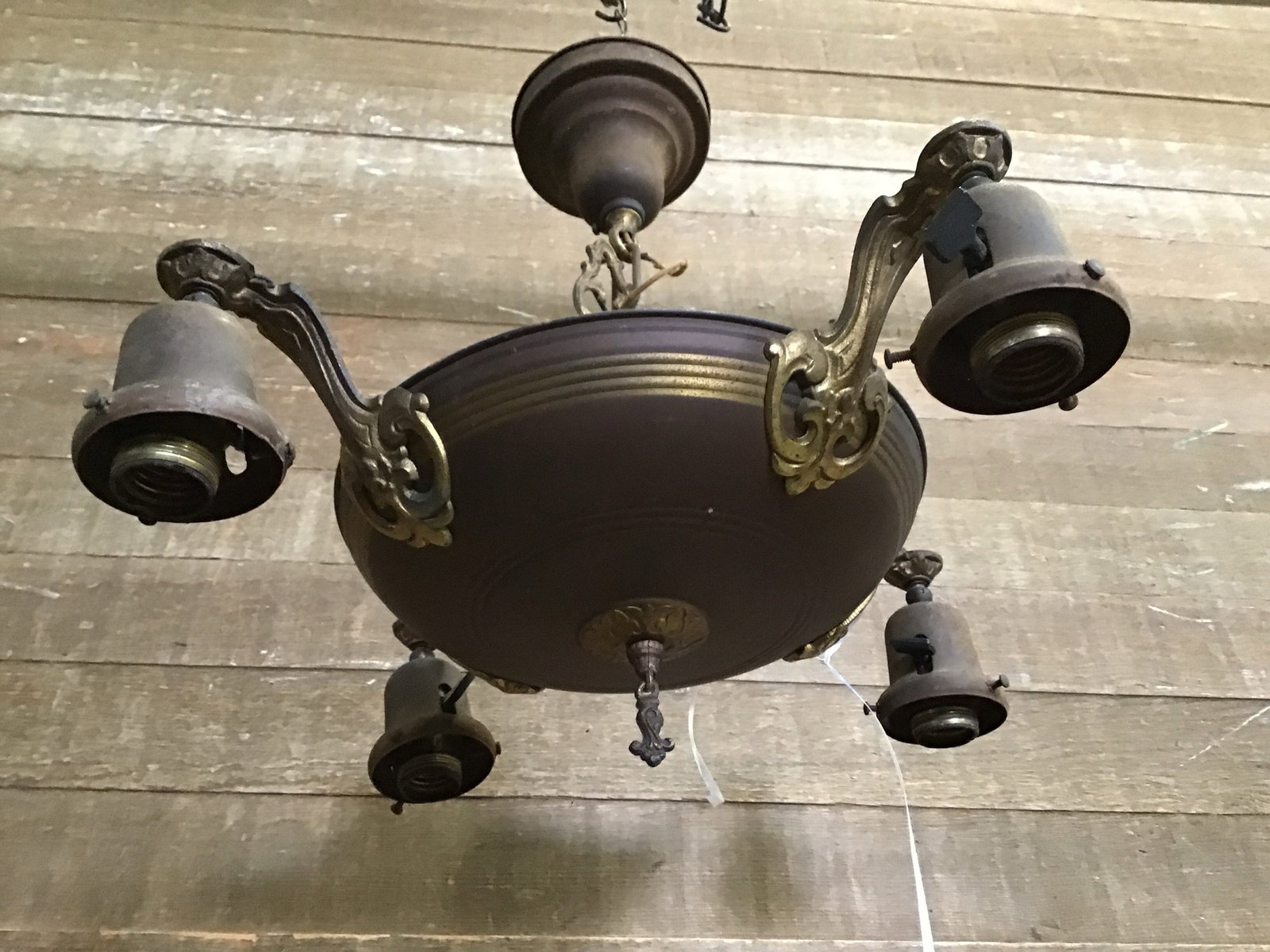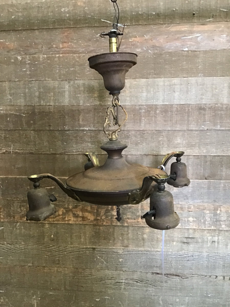 Very beautiful vintage hanging light that needs some love! This is a four bulb, brass light. In need of new sockets/wiring and shades. Price reflects. If you want this light, but not sure how to rewire, check out our lighting services in Seattle here!