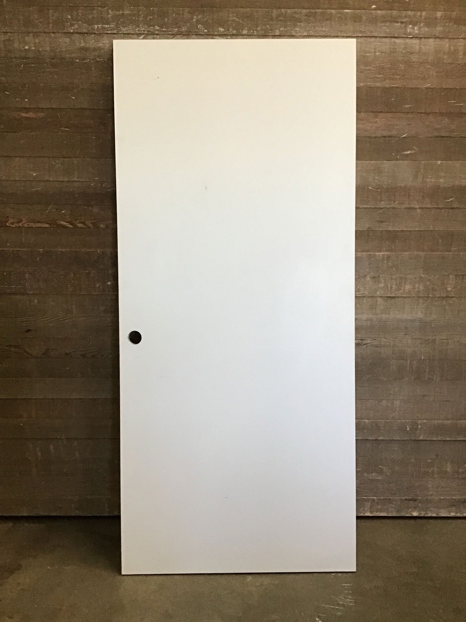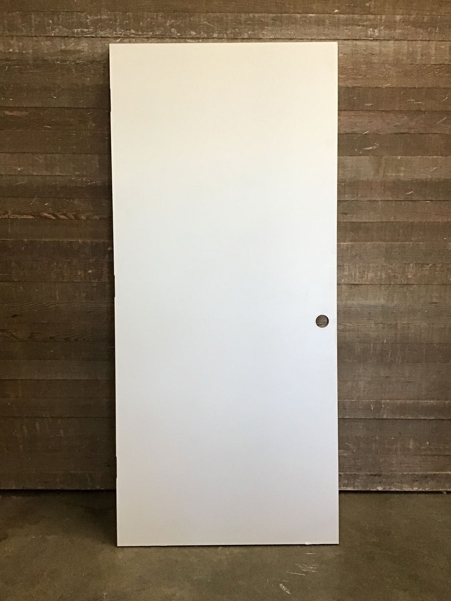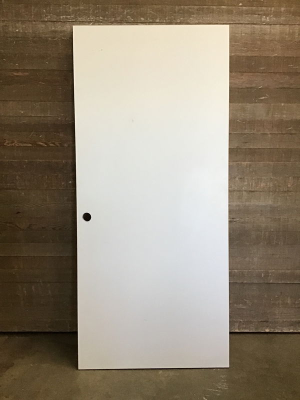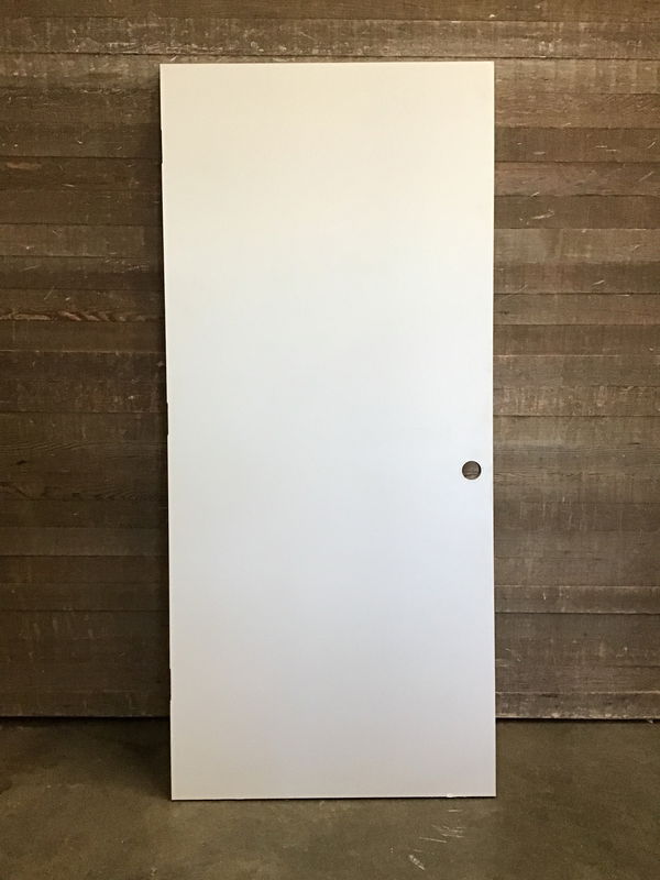 Primed white solid core interior door. Right hand swing. Does not appear to have been installed but is pre drilled.