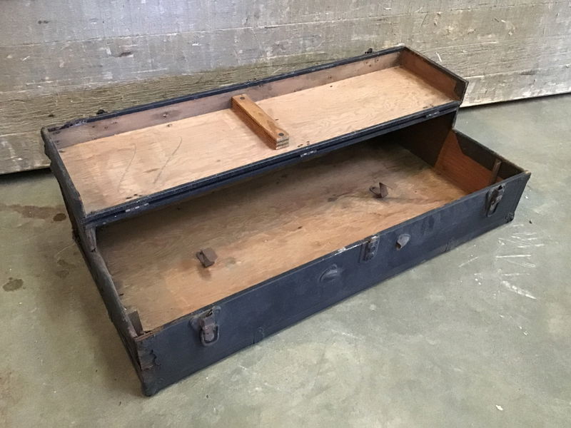 Vintage tool chest that is steel clad with a wood interior. The latches work, but it is missing the handle. The front half of the top flips open and lays flat on the back half. There's a couple of steel brackets on the inside, likely to hold the original tool it came with. Throw some tools inside if you wanna use it as a tool chest, or throw some legs on it and make a one of a kind side table! There is some heavily corroded parts on the steel clad cover, price reflects.